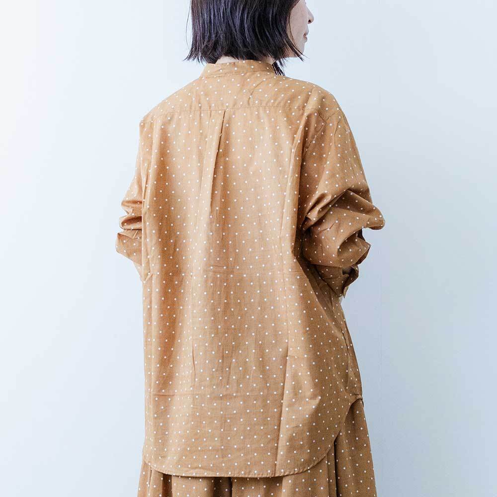 60ローンのドット生地を使用したドット柄バンドカラーシャツです。