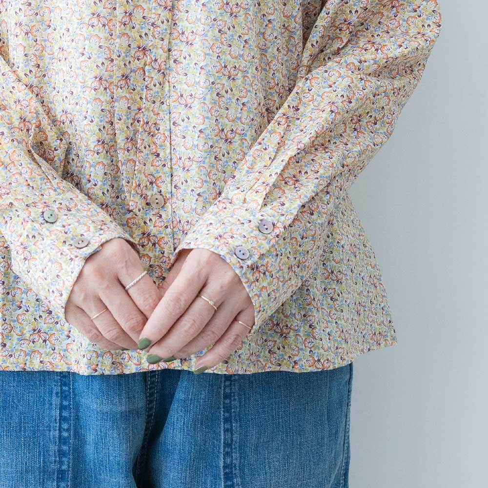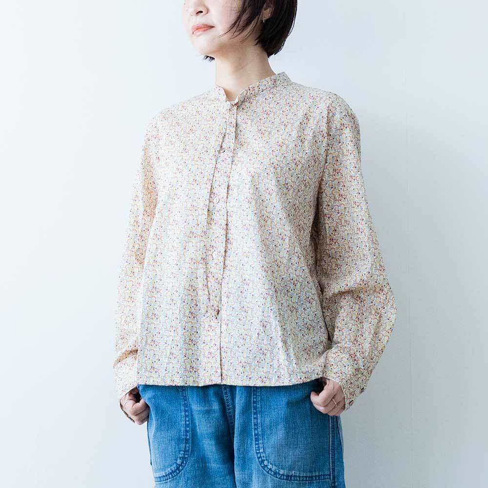 シルクのような上品な光沢と、なめらかな肌触りが魅力の「タナローン」素材を使用したLIBERTYプリントのボウタイシャツです。