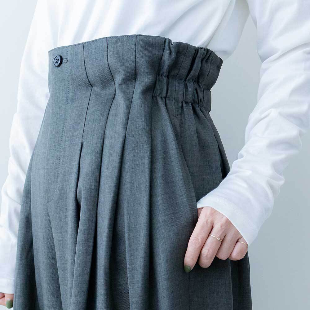 腰位置より下からデザインされているタックのおかげでウエスト前はすっきりしながら、後ろギャザーでラインのカバー力も抜群です。