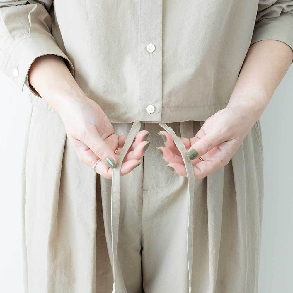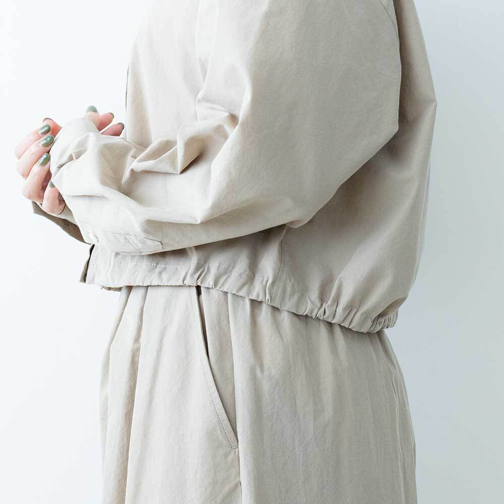 コットンナイロン交織のブランドオリジナルの生地を使用しており、ドライタッチなテクスチャーの上品な光沢が特徴です。