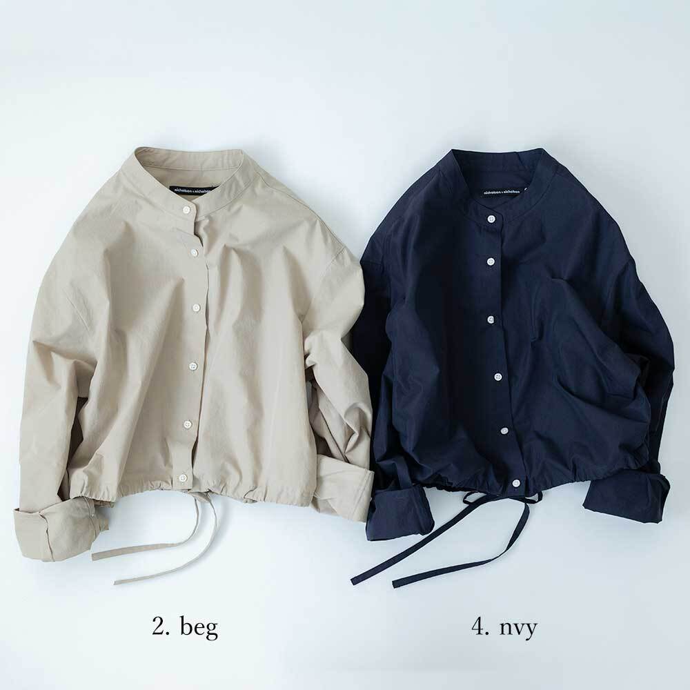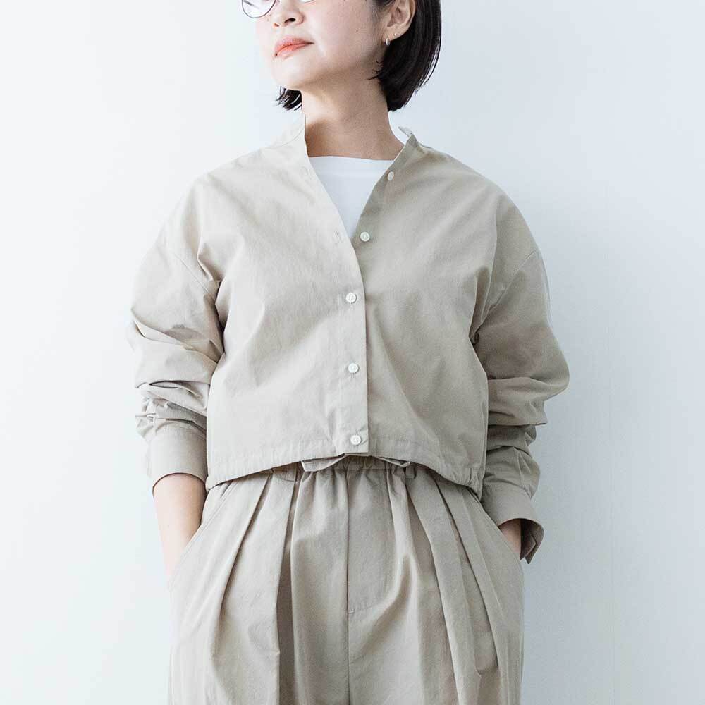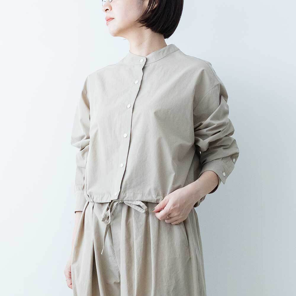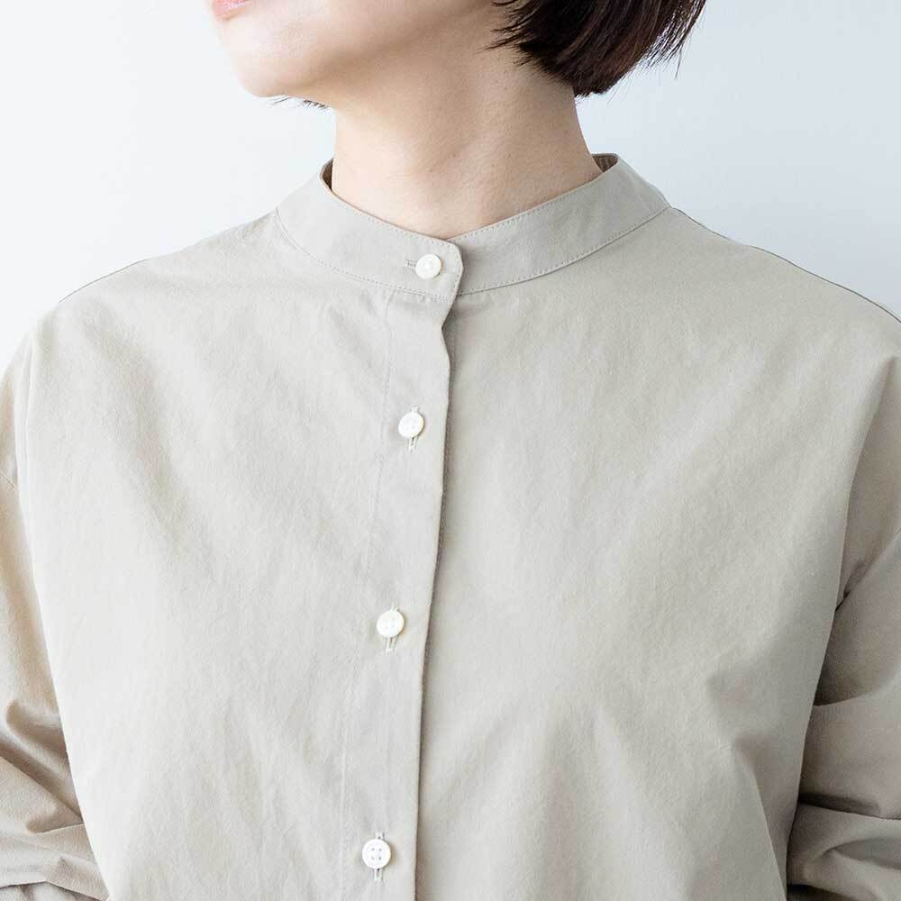 やや短めでスッキリとした着丈のバンドカラーシャツです。