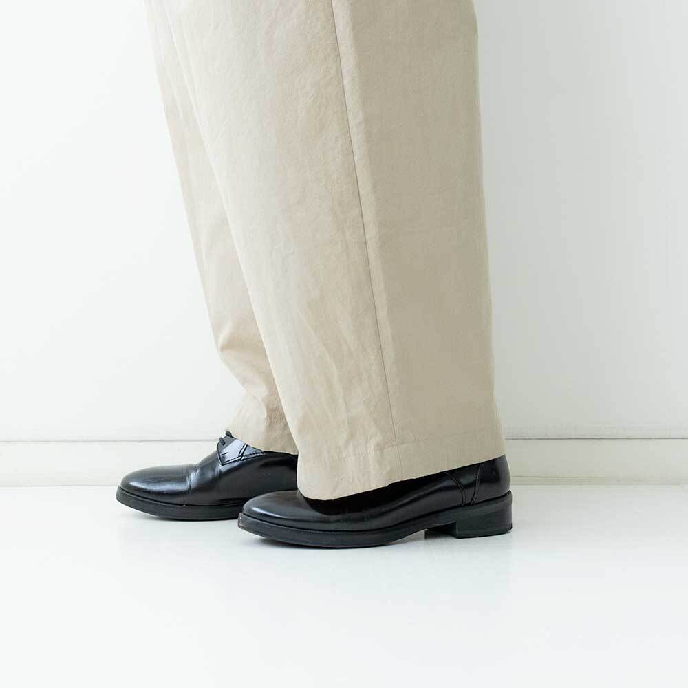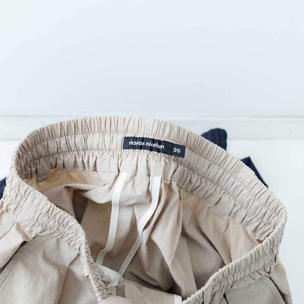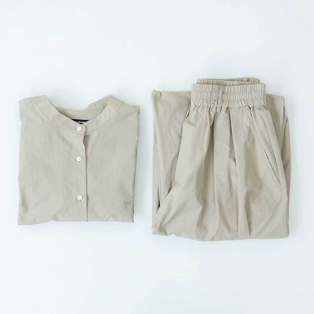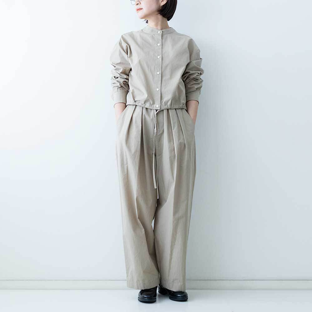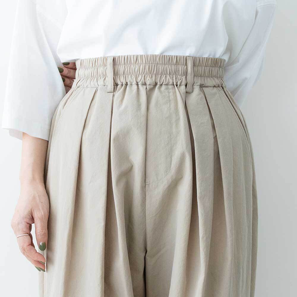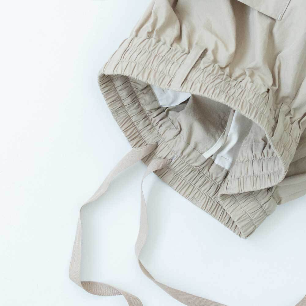 ストレートに落とした美しいラインが魅力で、ウエストはゴム仕様に加え、裾にはドローストリングのアレンジを加えシルエットの変化が楽しめるようになっています。