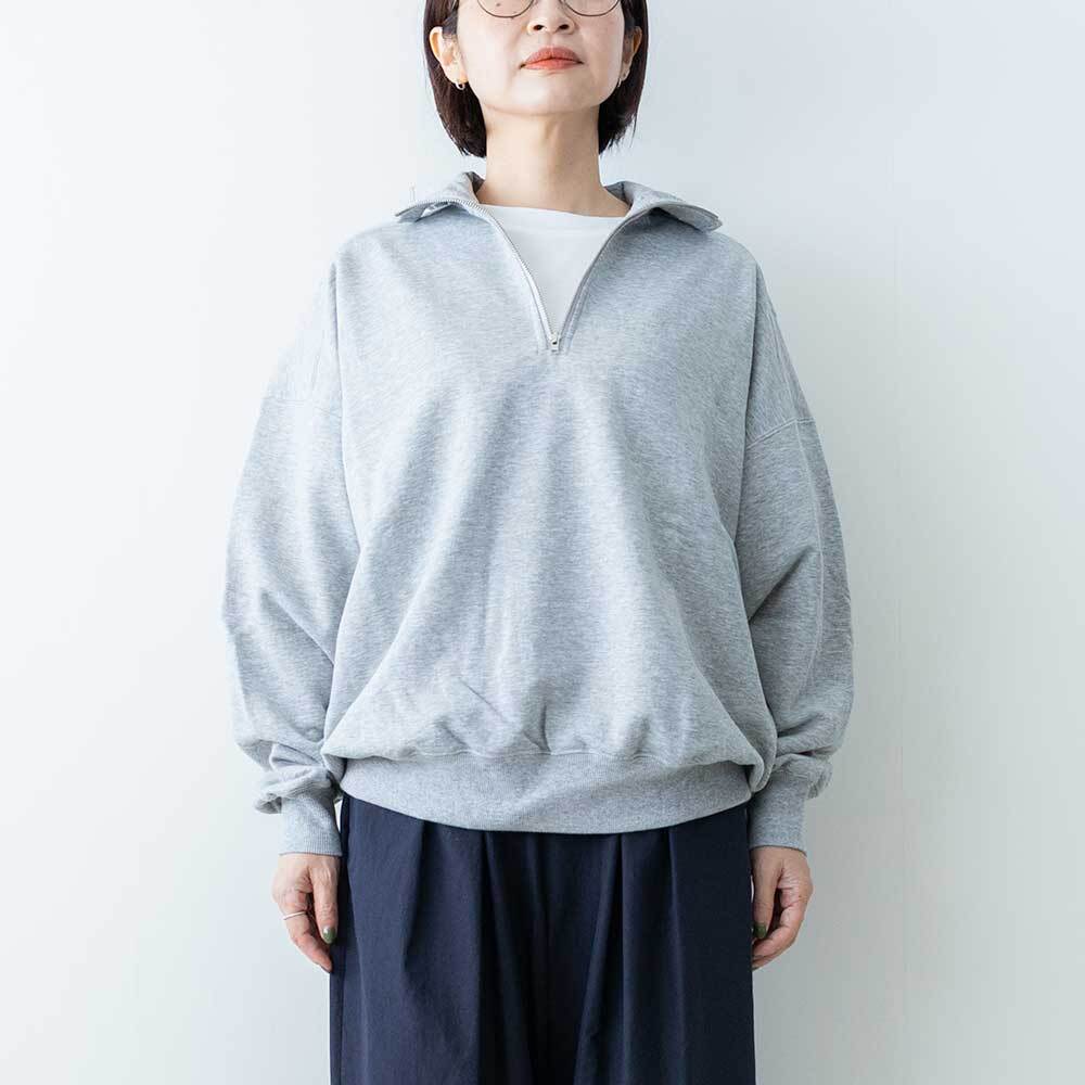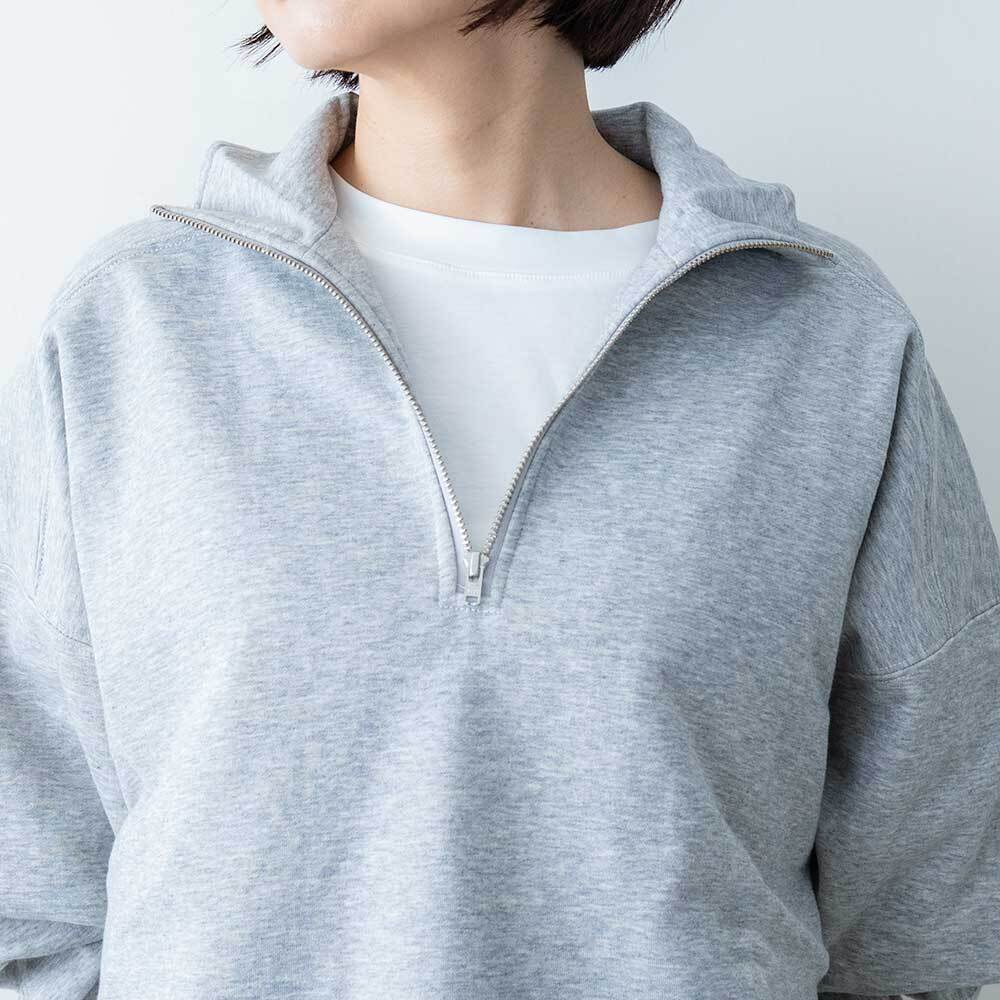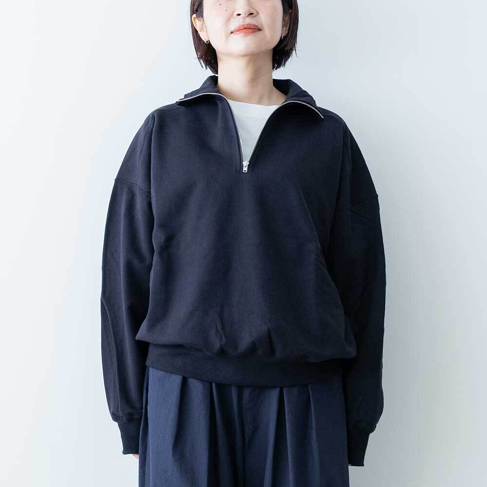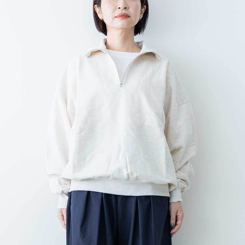ゆったりとしたシルエットに首元のハーフジップがアクセントとなったスウェットです。