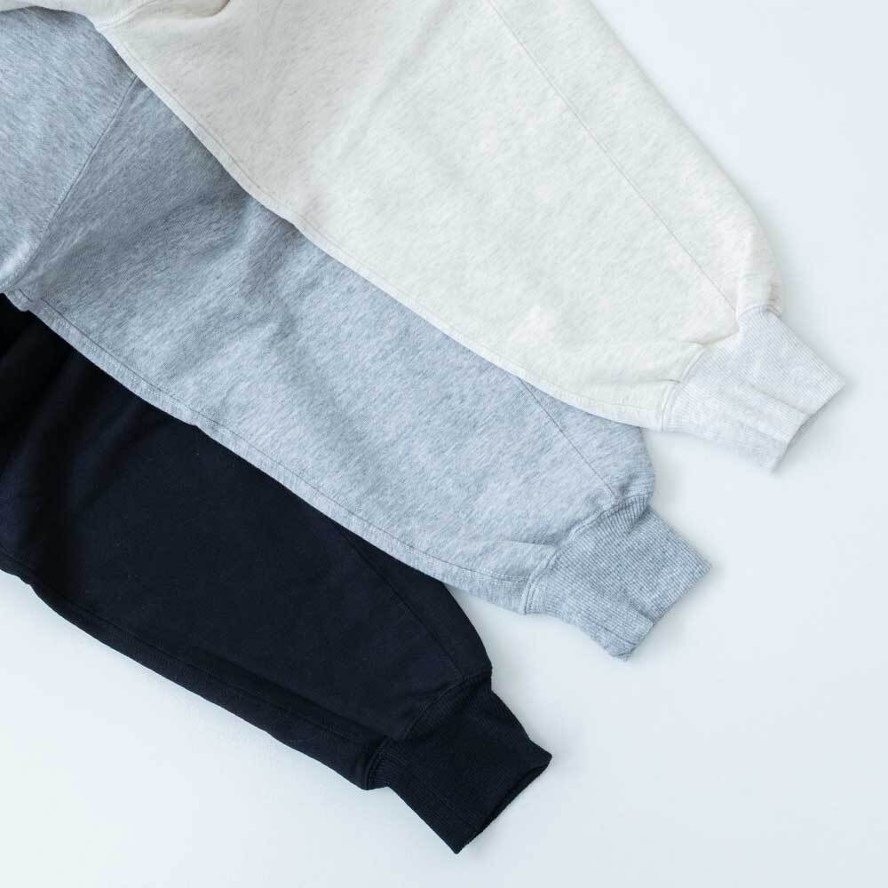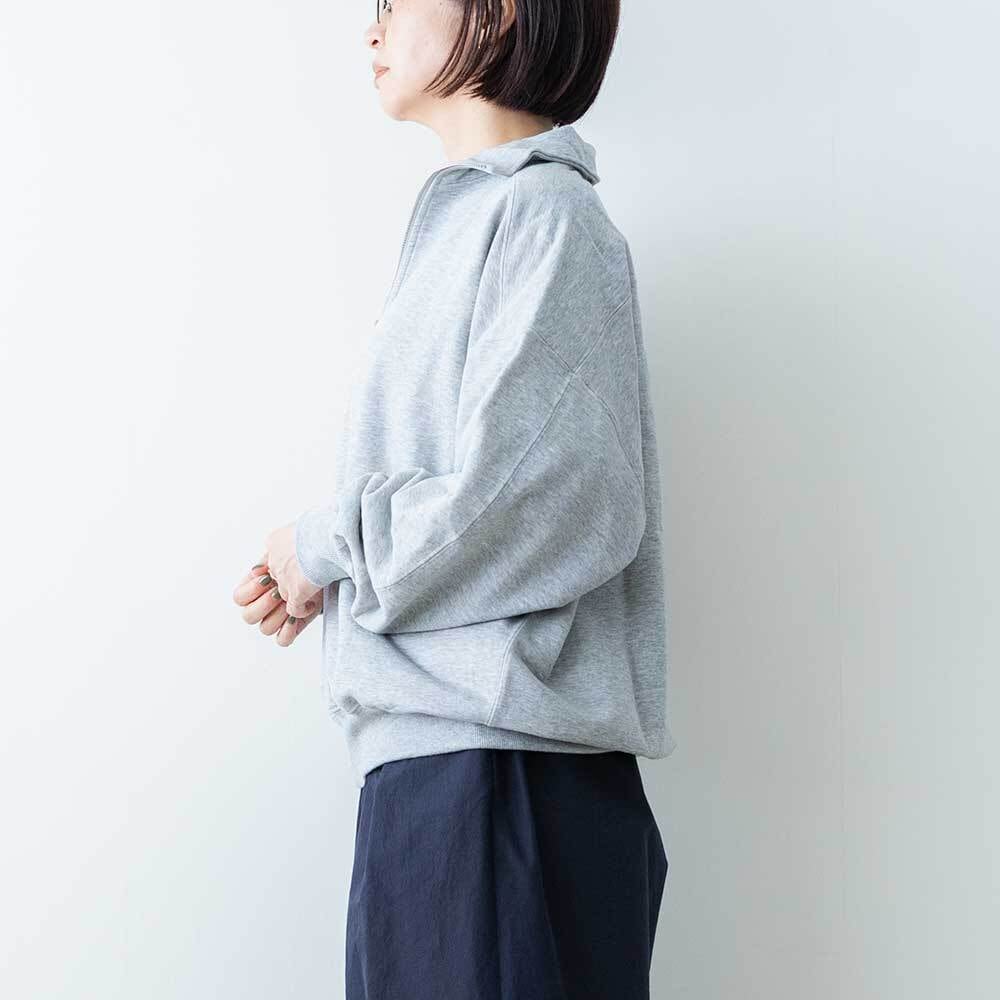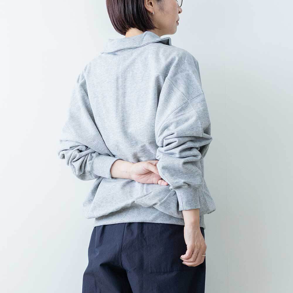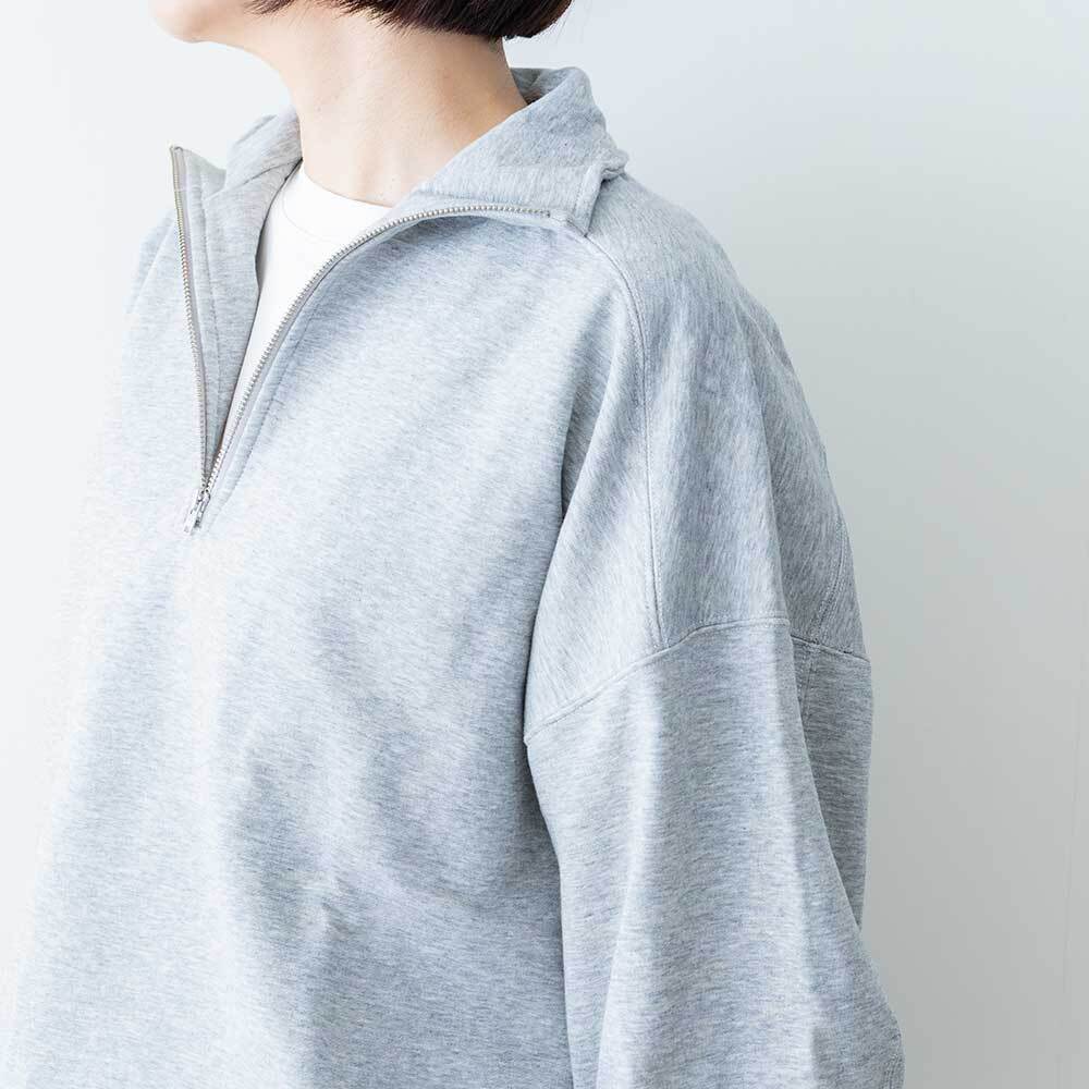 ゆったりとしたシルエットに首元のハーフジップがアクセントとなったスウェットです。