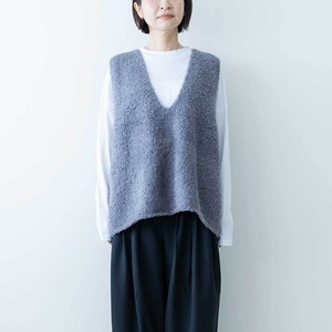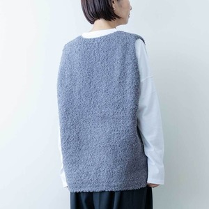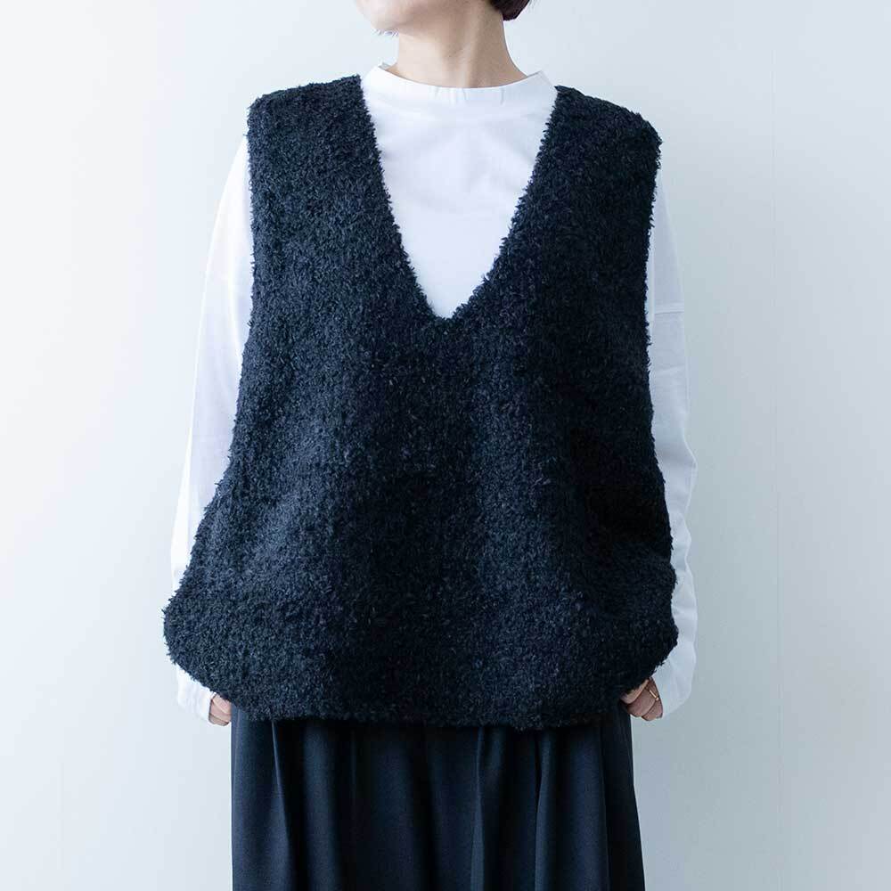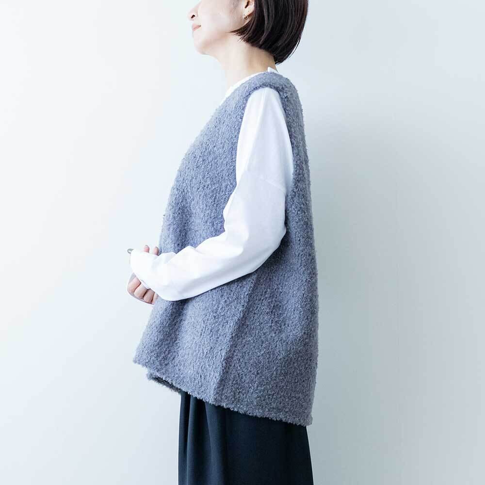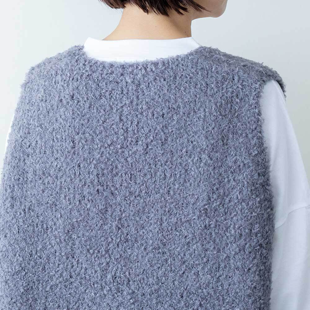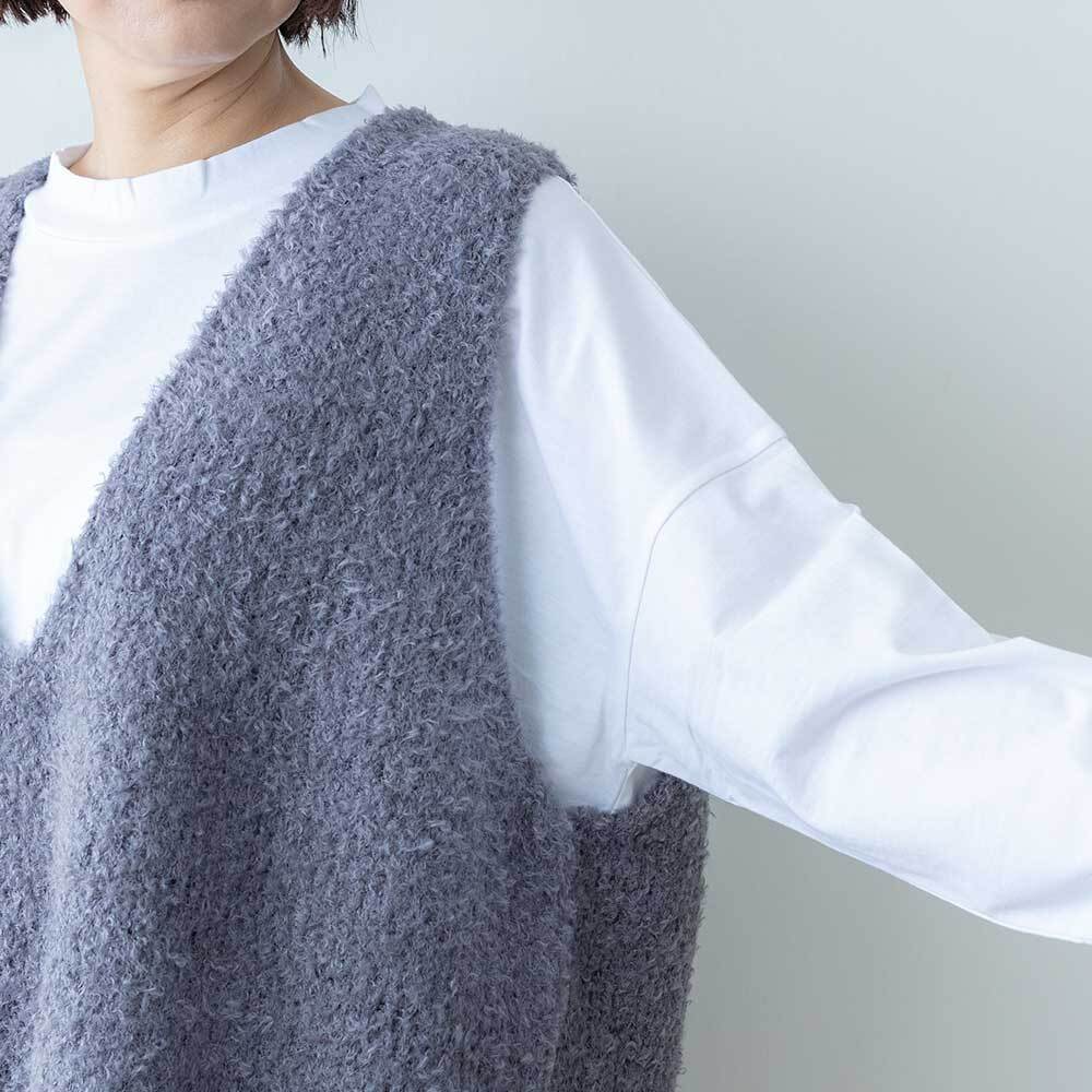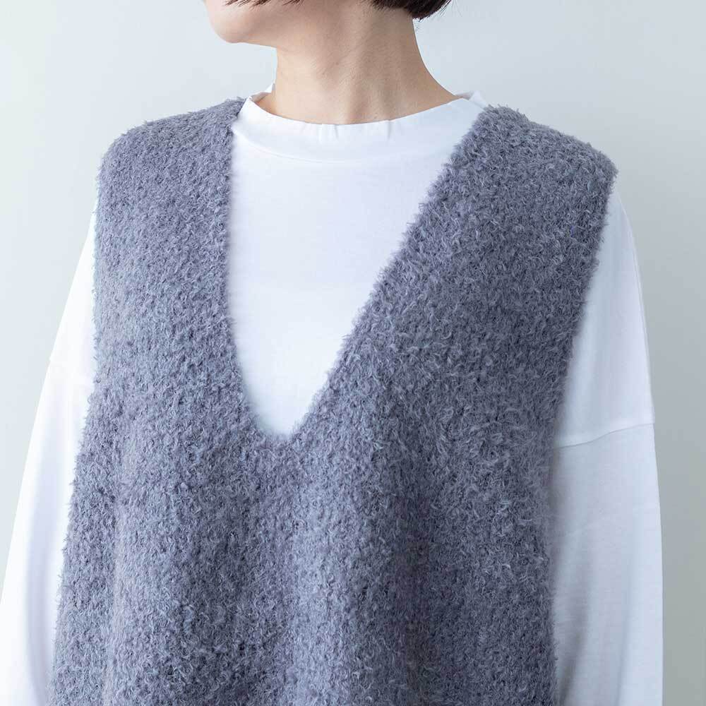 プードル糸を使用したふわふわで立体感のある素材が魅力のヘアリーVネックベストです。見た目にも暖かみのあるベストで、インナー見えする深いVネックと袖を通しやすい広めのアームが特徴。ヒップの隠れる丈感でモコモコとした丁度良い肉厚感は、上からアウターも着用しやすいのがポイントです。同シリーズ3-220100/ポケット付きヘアリークルーネックカーディガンも展開。mizuiro ind人気のベストアイテムで秋の着こなしをいち早く演出できる1枚です。