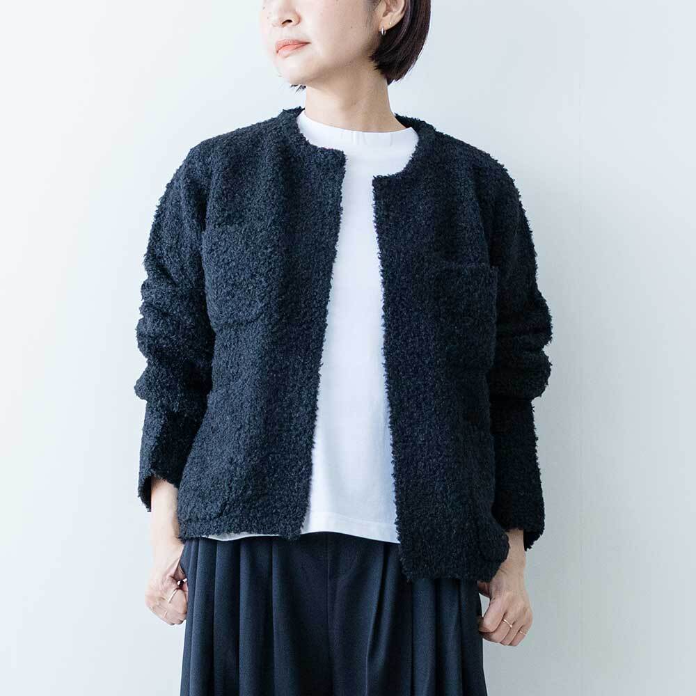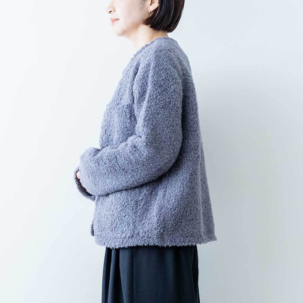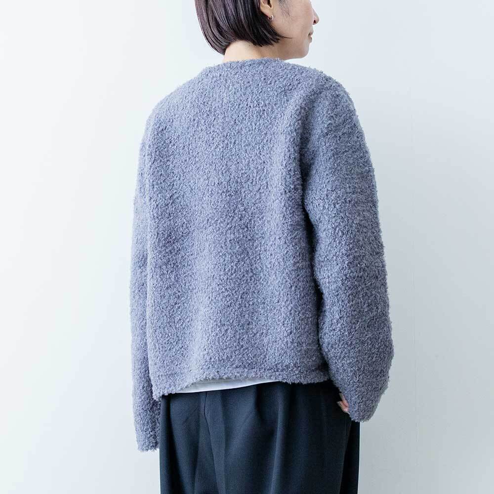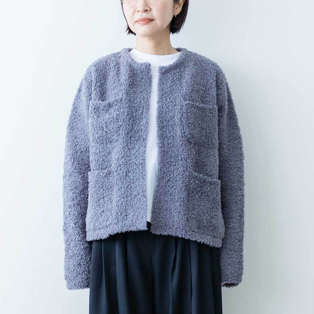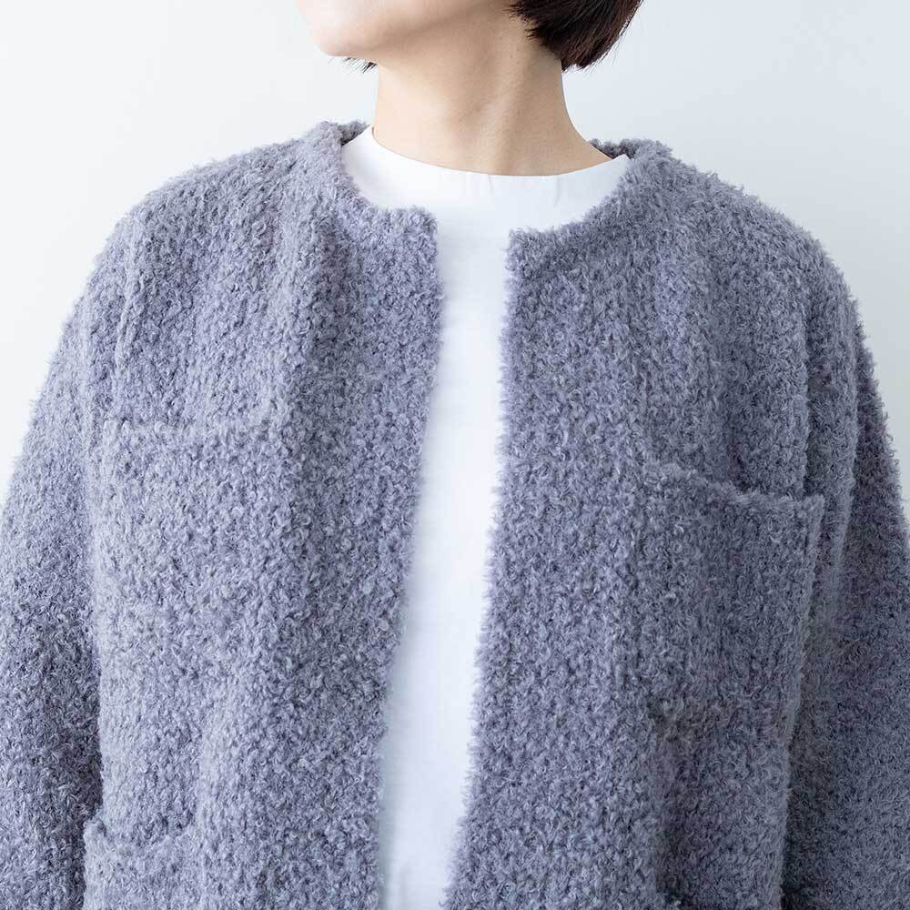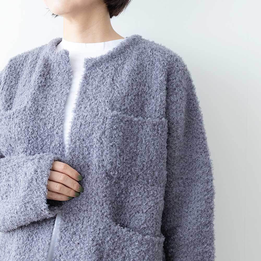 プードル糸を使用したふわふわで立体感のある素材が魅力のポケット付きヘアリークルーネックカーディガンです。ビンテージジャケットをベースにデザインしました。見た目にも暖かみのあるカーディガンで、フロントポケットが4つ付いたデザインが特徴。モコモコとした丁度良い肉厚感で上からアウターも着用しやすいのがポイントです。