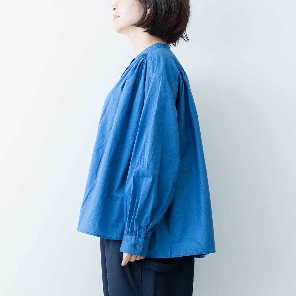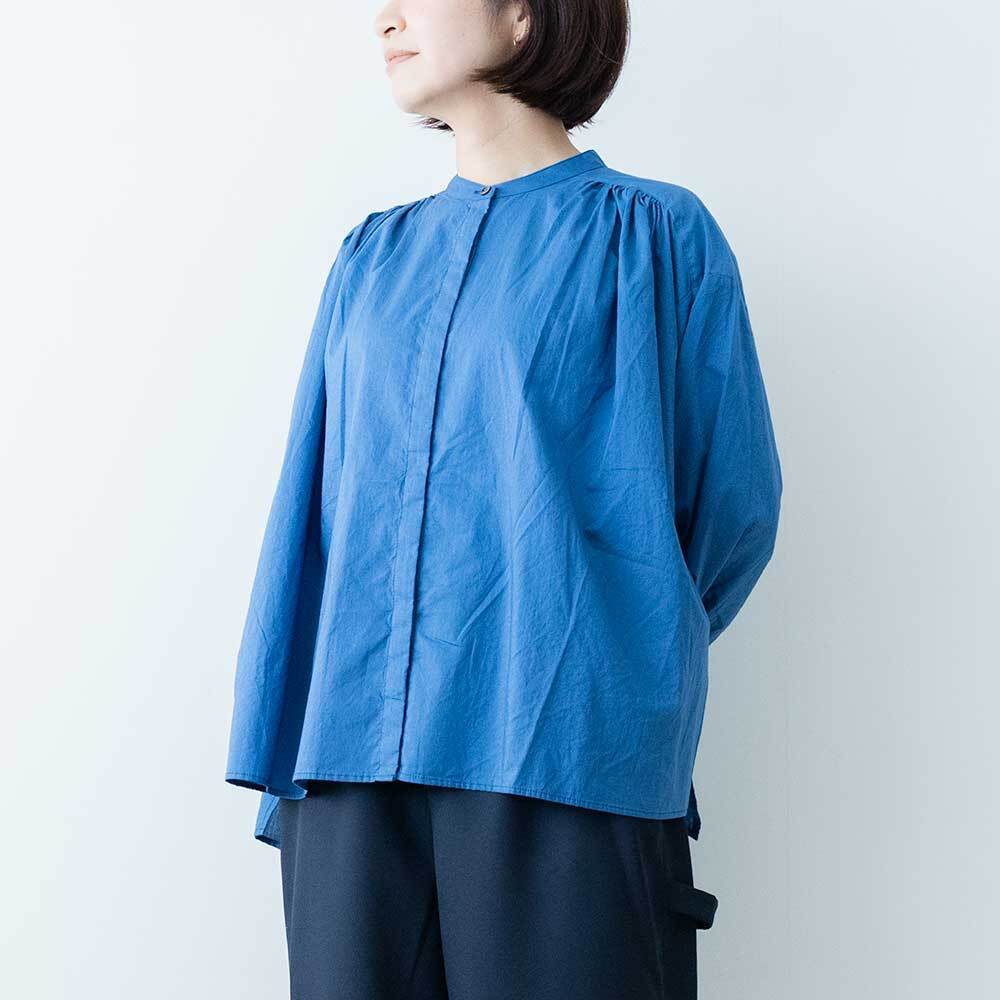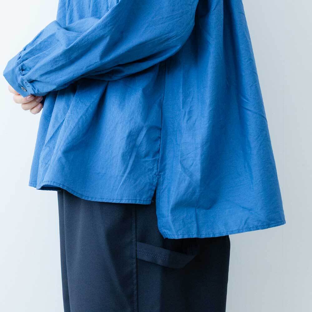 MidiUmi人気の1枚が今季新色を追加し新登場。60ローンの少しハリ感と透け感のある生地でショート丈のフンワリとしたシルエットが印象的。フロントボタンを使用。肩や背中に細かなギャザーを施したことで前後で動きのあるデザインが特徴。裾は前後差を付け若干のスリットが入っています。身幅は余裕のあるワイドサイズなので優雅なシャツの動きも魅力的。シンプルに着回しのきく1枚です。