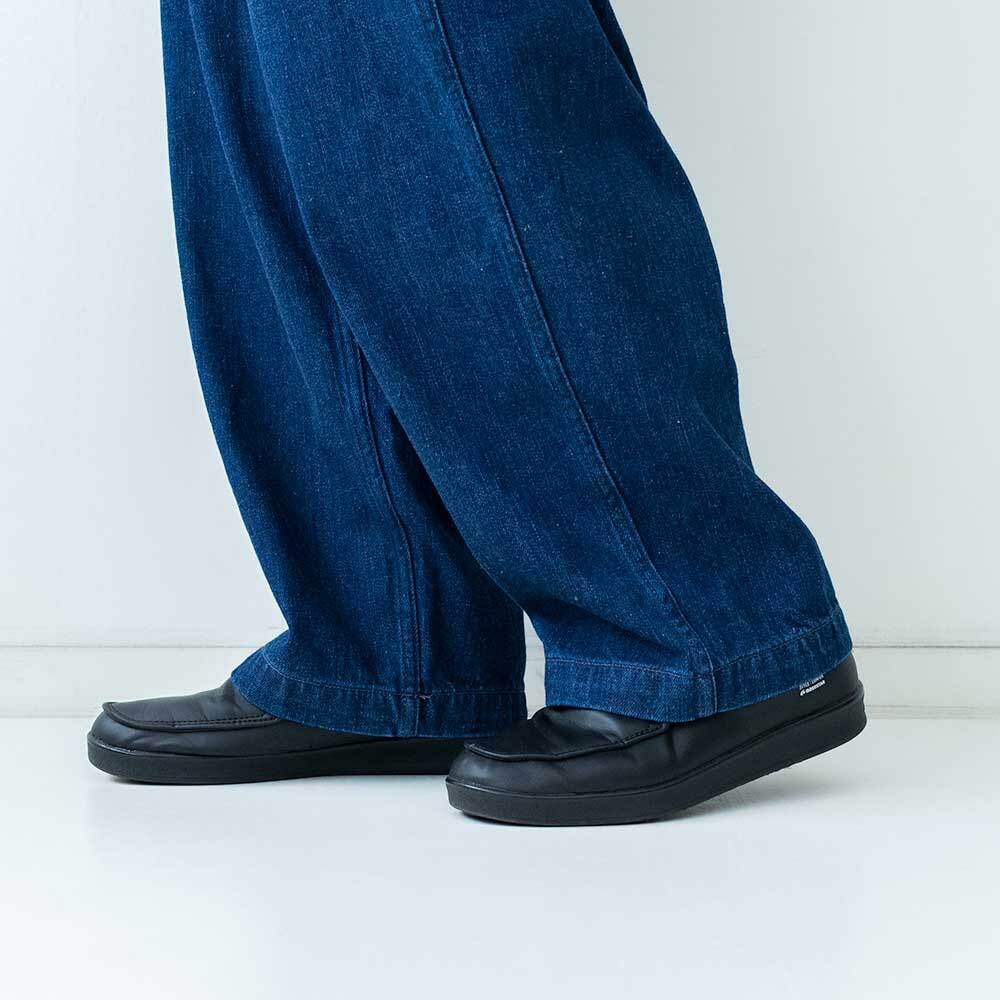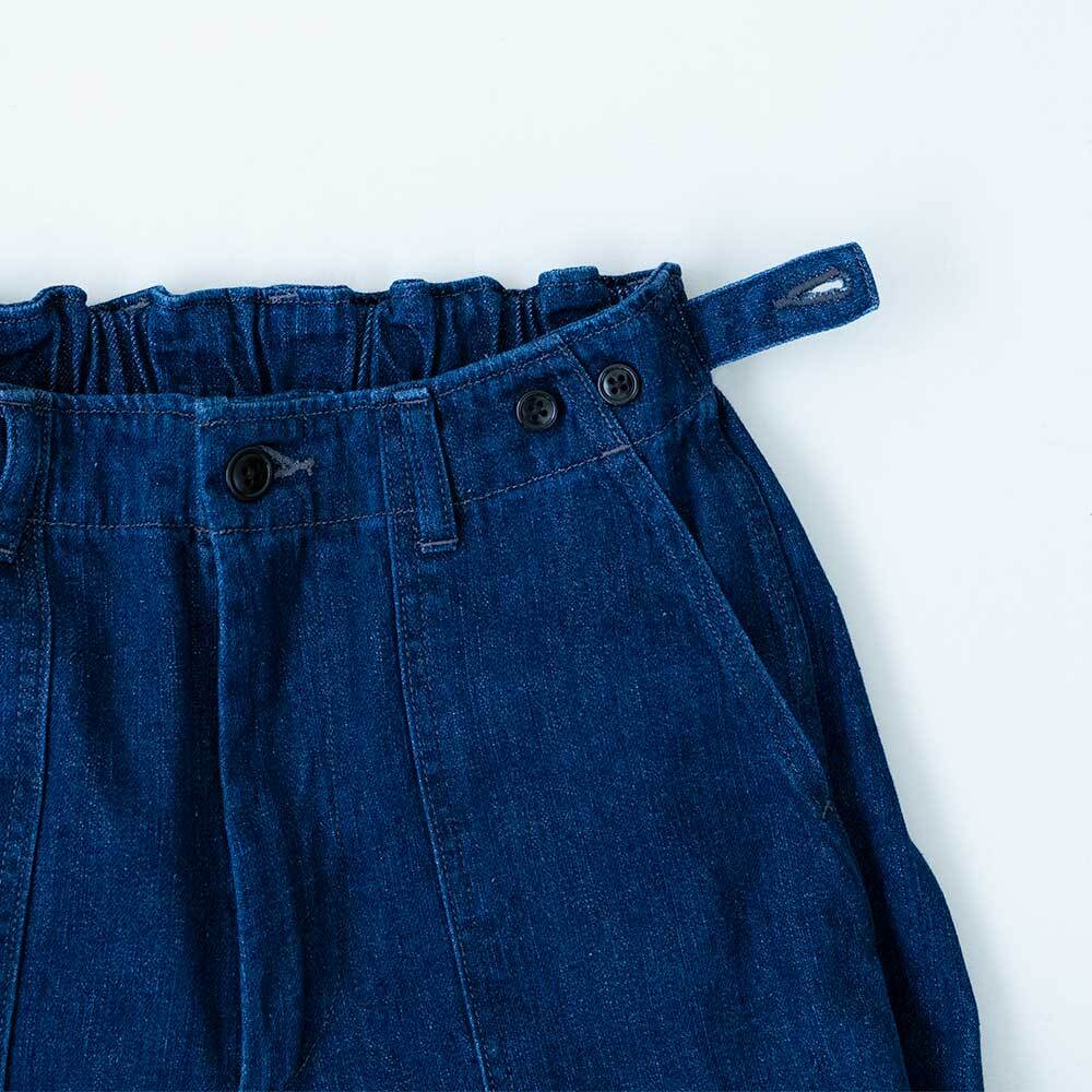 ウエストの後ろ部分はゴム使用で、タテ糸にリバイバルコットン(落ち綿)を使用したネップ糸を使用した甘織りの柔らかいデニムなので履き心地は抜群です。