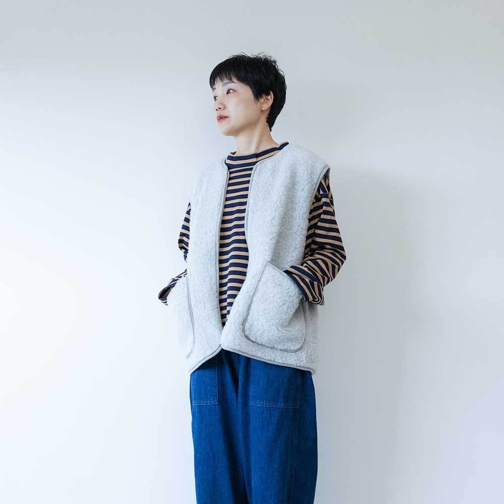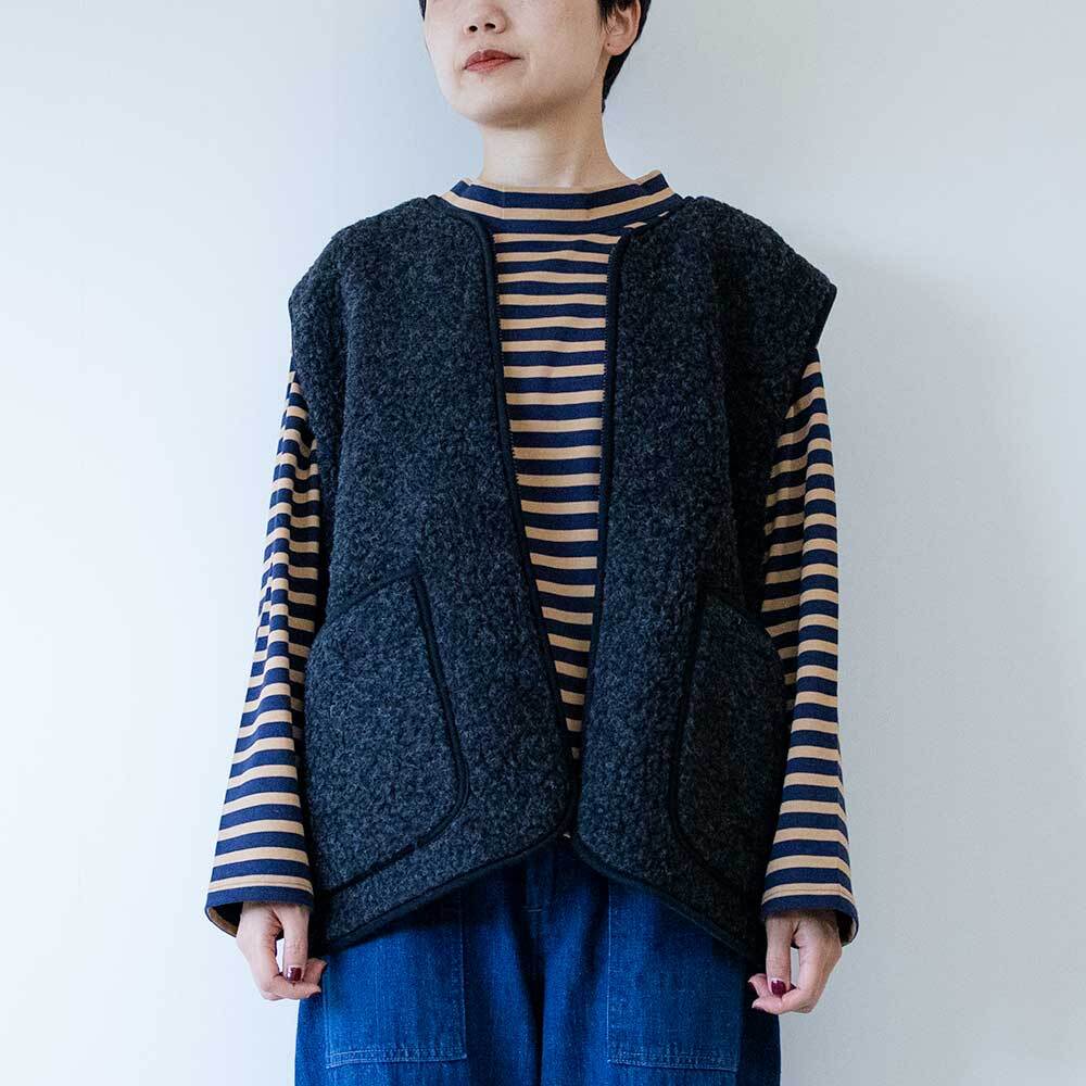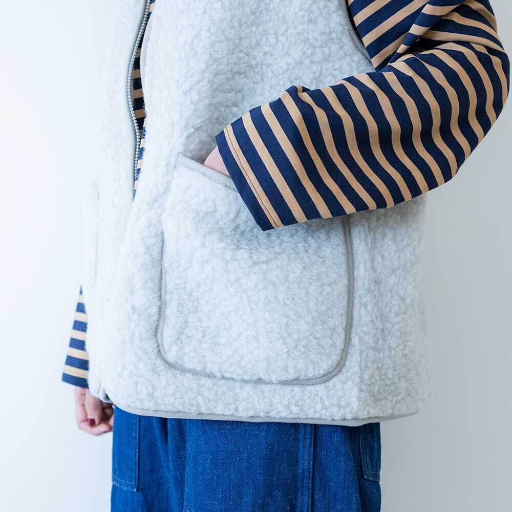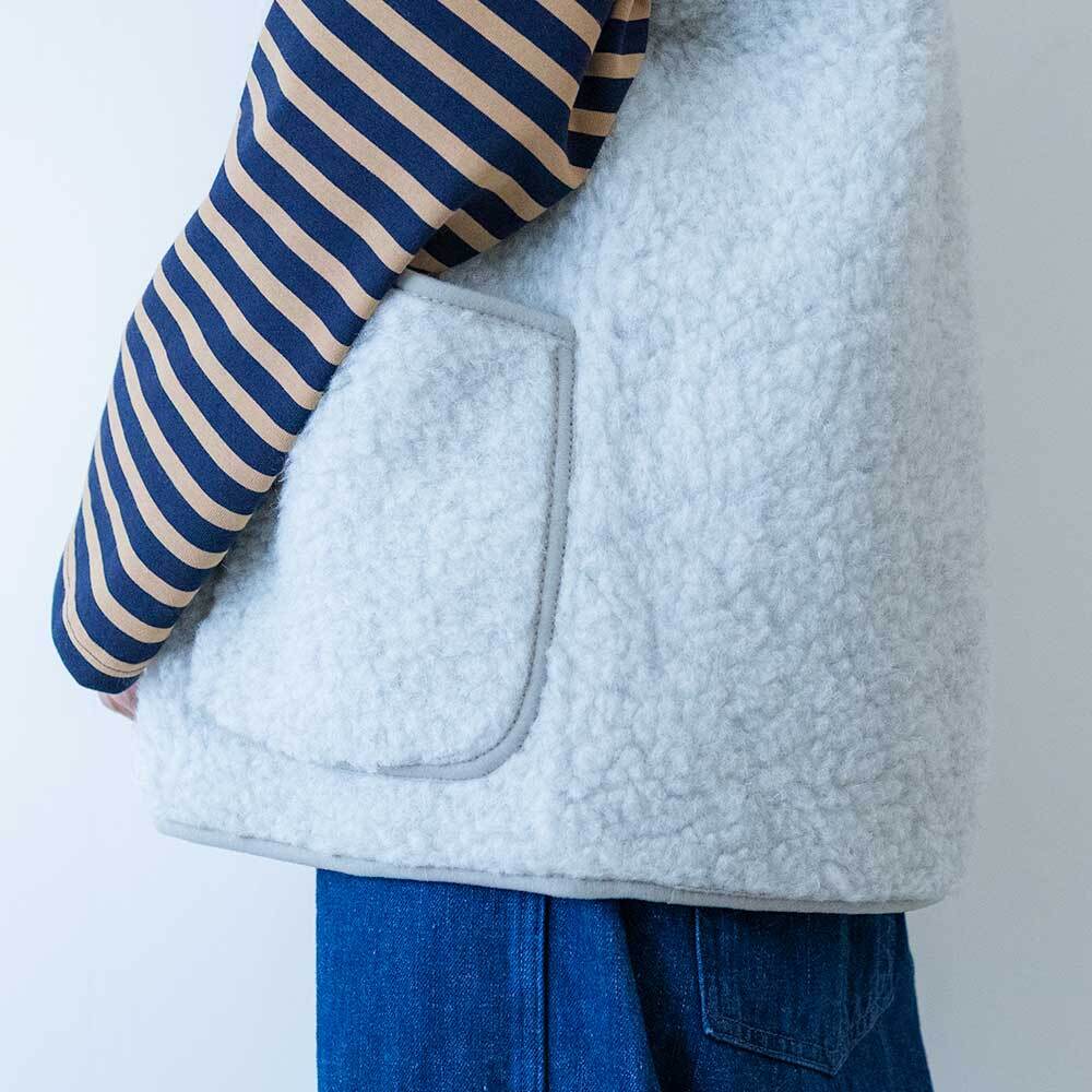首元や袖口、ポケットに入った異素材のパイピングがポイントで、寒い日にお家で着ていただくのはもちろん、秋はアウターとして、真冬はコートのライナー代わりにもお使いいただけます。