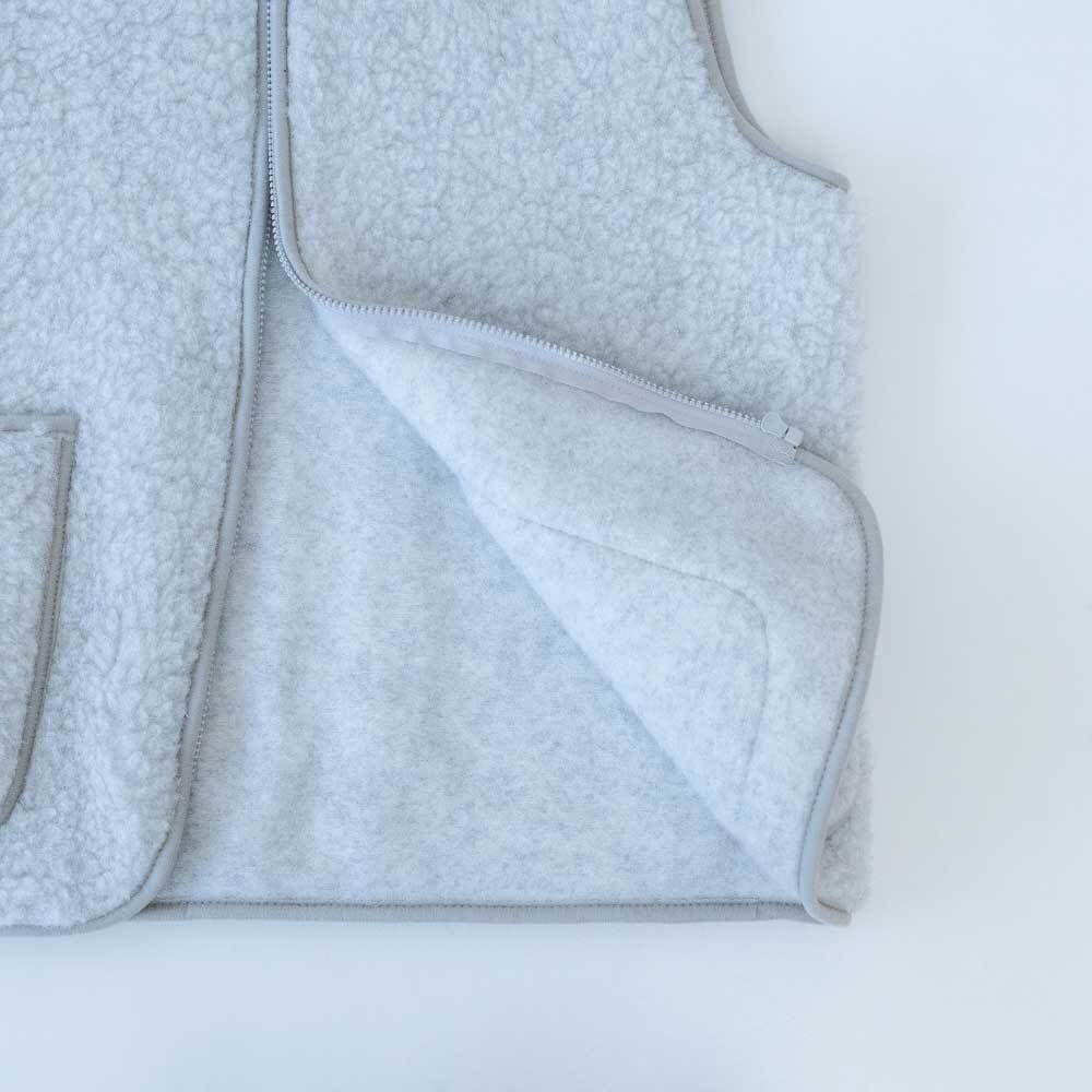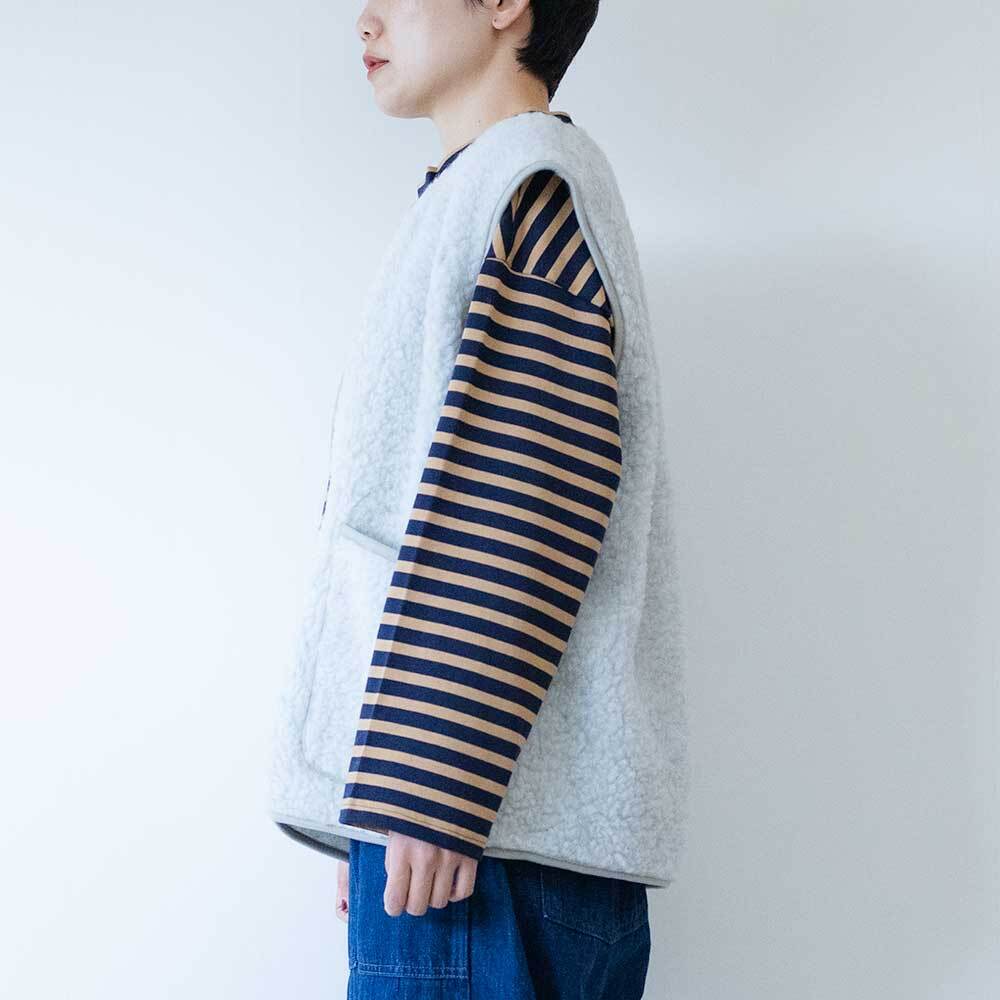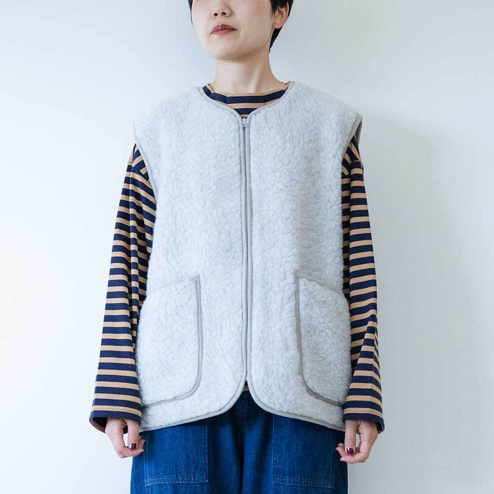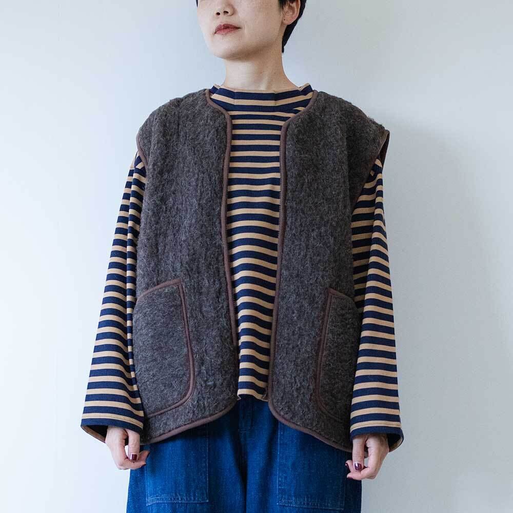 首元や袖口、ポケットに入った異素材のパイピングがポイントで、寒い日にお家で着ていただくのはもちろん、秋はアウターとして、真冬はコートのライナー代わりにもお使いいただけます。