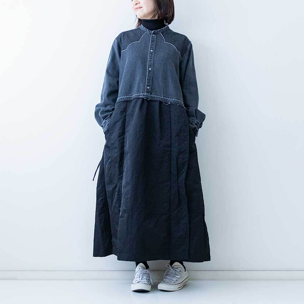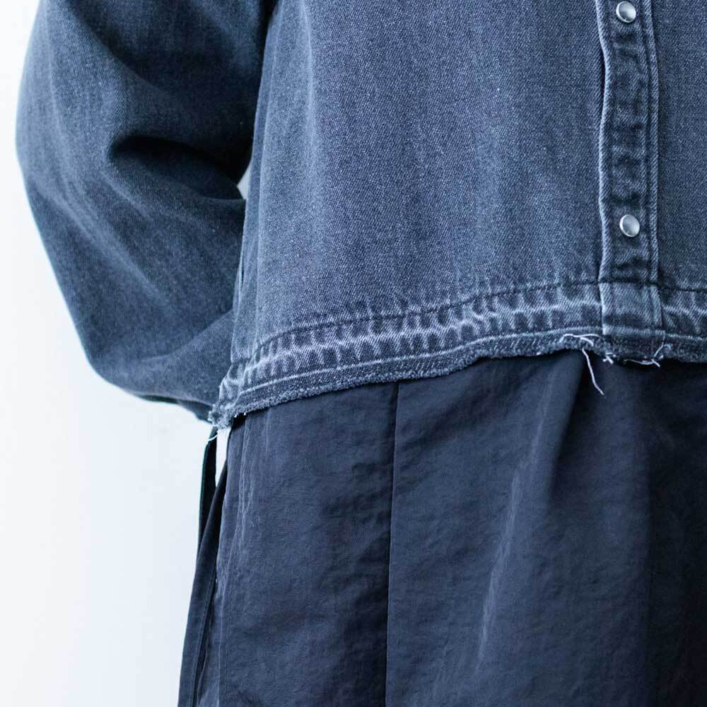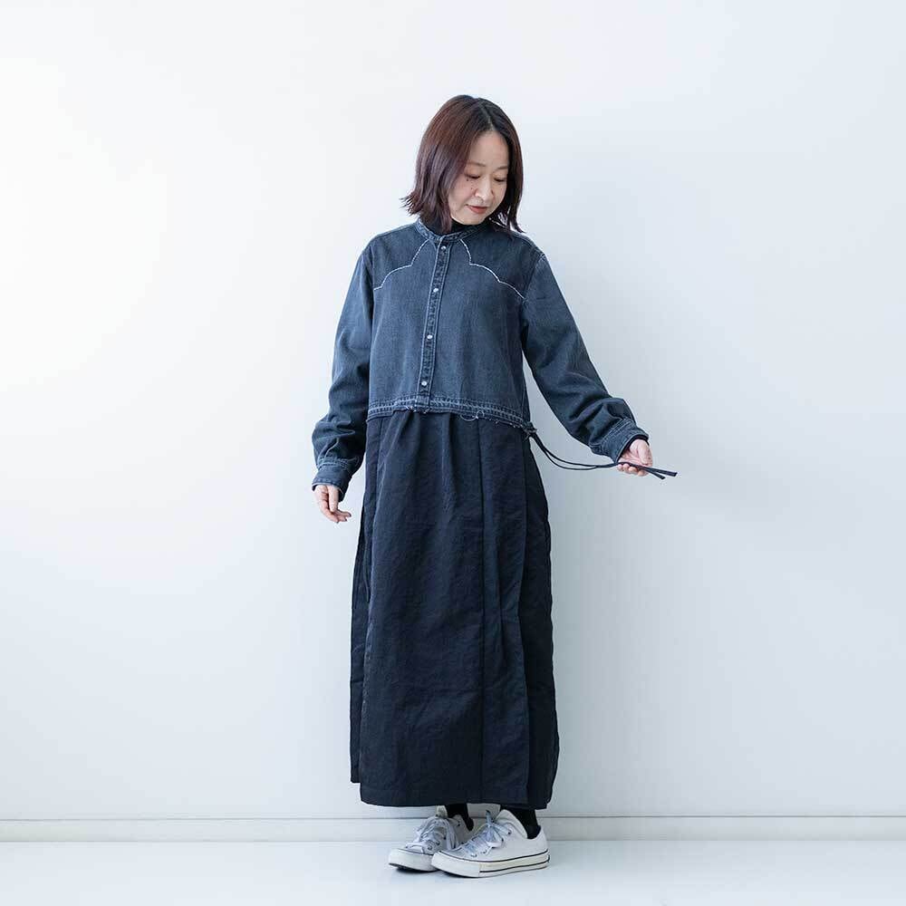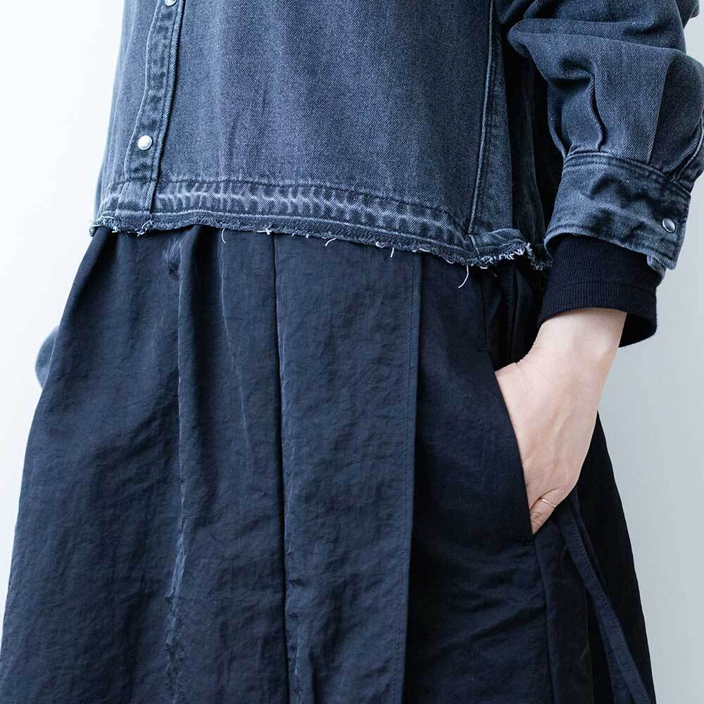 ノーカラーウエスタンシャツとワッシャー加工を施したMA-1ツイルをドッキングしたワンピースです。