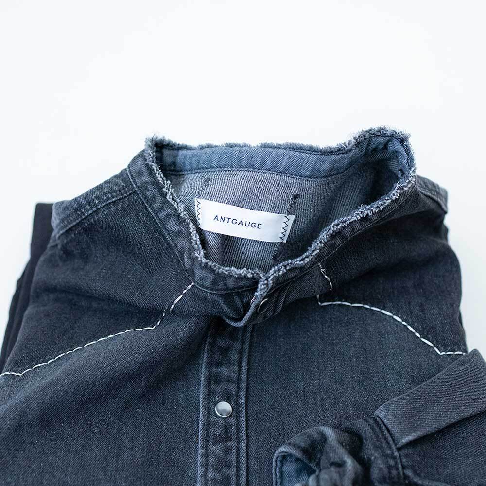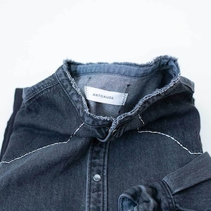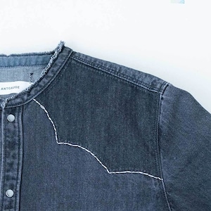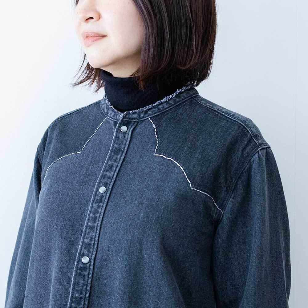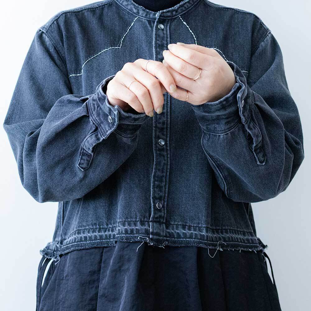肩ヨーク部分には、はがし型+シルバー糸でランダムなハンドステッチ風のアクセントを施し、独自の風合いを演出しています。デニムシャツ裾の解き加工もデザインのポイントで、スカートサイドはAラインになっているのでパンツとの重ね着でも、1枚で着てもきまるシルエットになっています。
