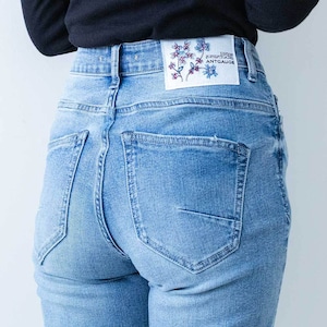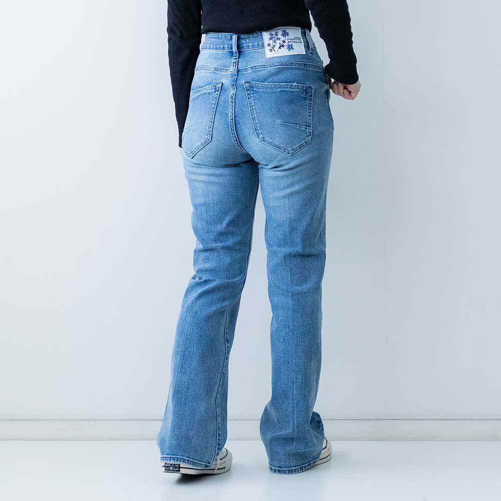 股上は浅めに、帯に伸縮性を持たせることで抜群の穿き心地を実現しています。ノスタルジックな雰囲気を感じさせるスタイルに、フォークロアなカーブデザインのポケットや花刺繍パッチがさりげないポイントです。スッキリとした腰回りやヒップで美脚効果があるパンツです。