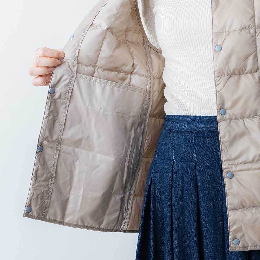 ジャケットやコートの下に着るのはもちろん、Tシャツ・シャツ・パーカーなどの上にも気軽に羽織れる、軽くて暖かく着回しやすいシンプルなデザインが特徴です。嵩高が高く、保温性の高い800FPダウンを使用しています。