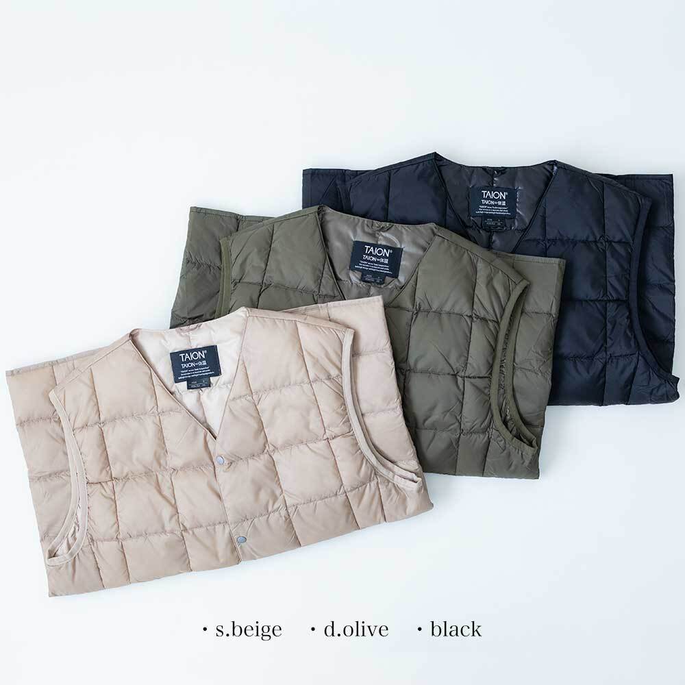 TAIONの定番、Vネックダウンベストです。