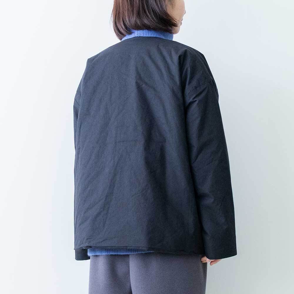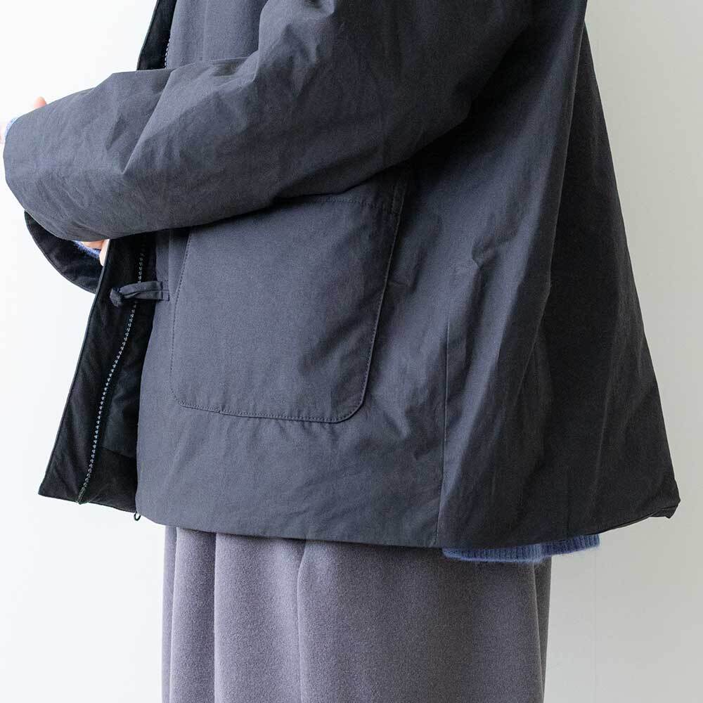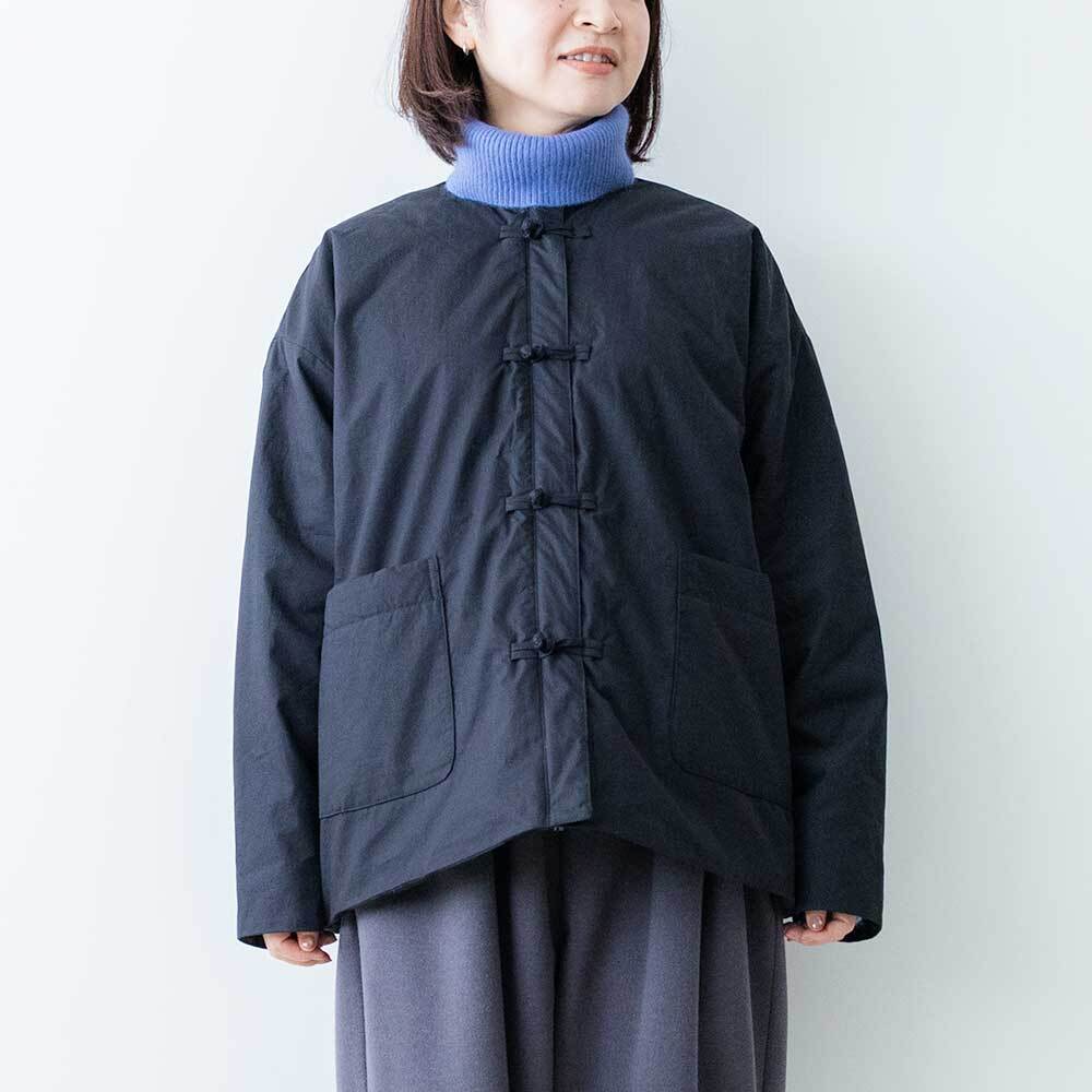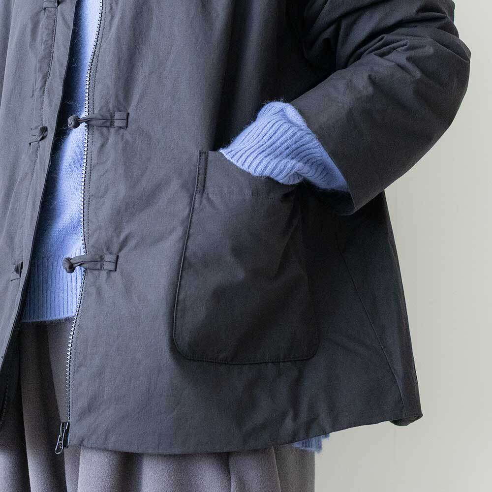 ゆったりな身幅にコンパクトなネックラインが上品な1枚で、共生地のチャイナボタンの下はファスナー開きの仕様なので、寒さもしっかりとしのいでくれます。
