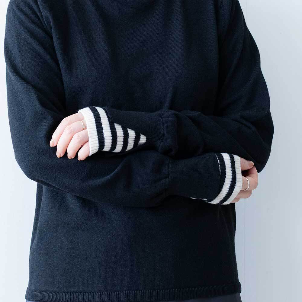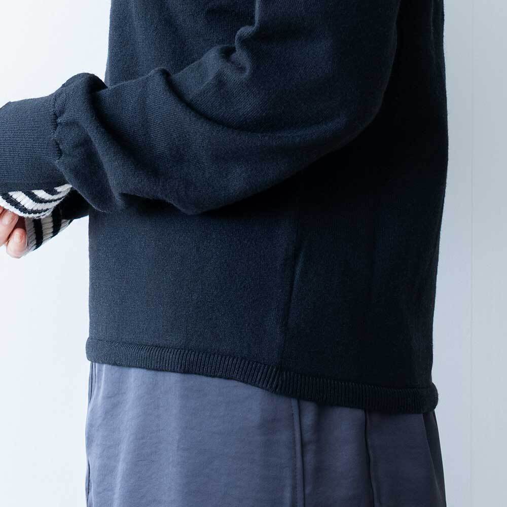 バイカラーのスリット入り2重カフスと、首元のバイカラーがポイントのトップスです。