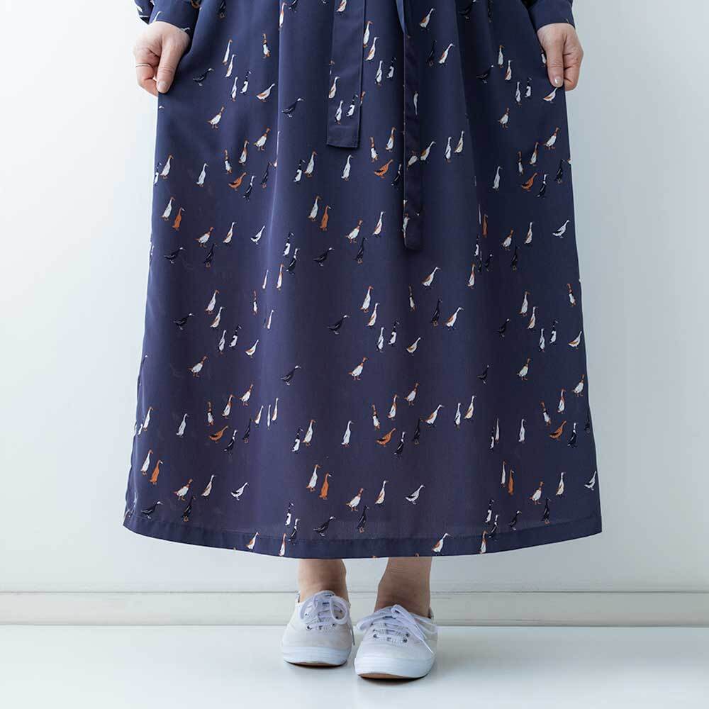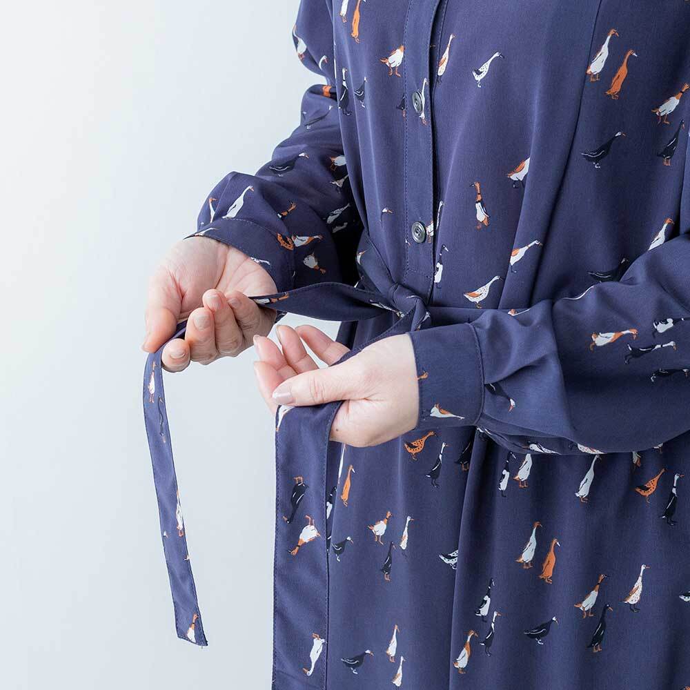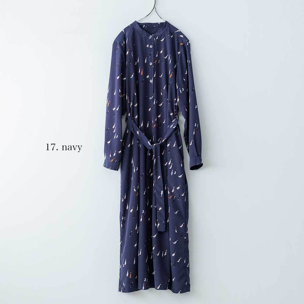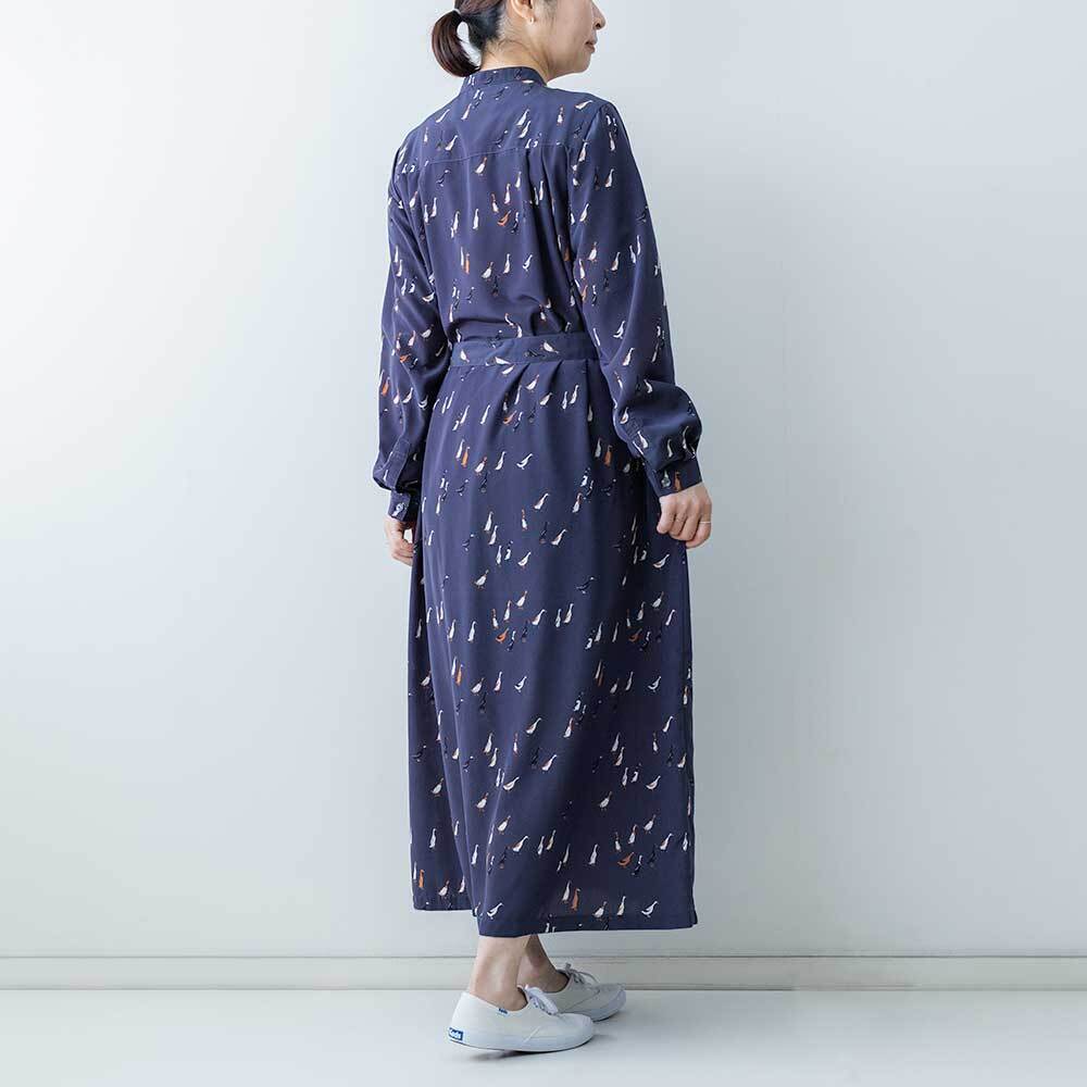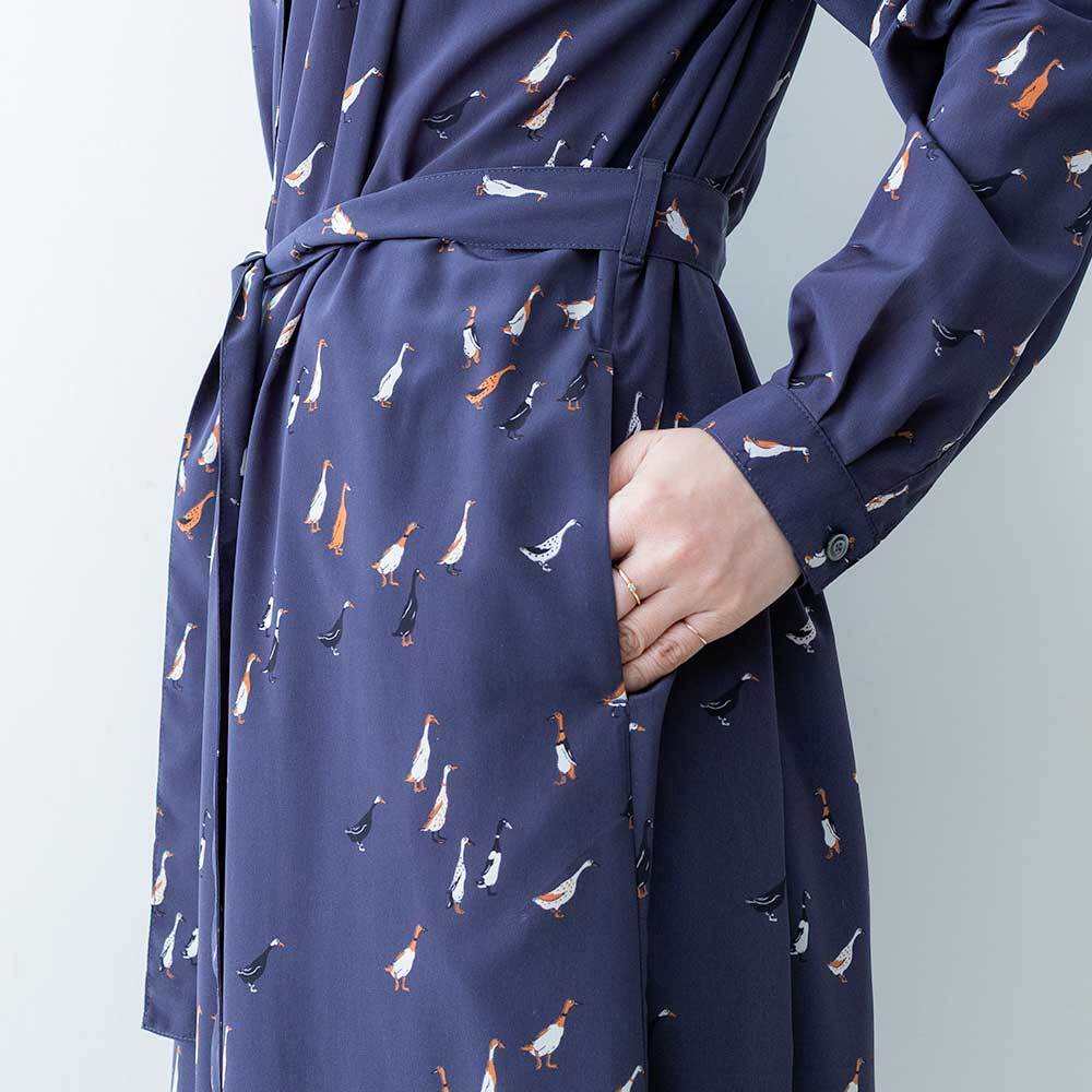 シックな色合いに、愛らしいアヒルモチーフを散りばめたブランドのオリジナルプリントのワンピースです。