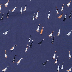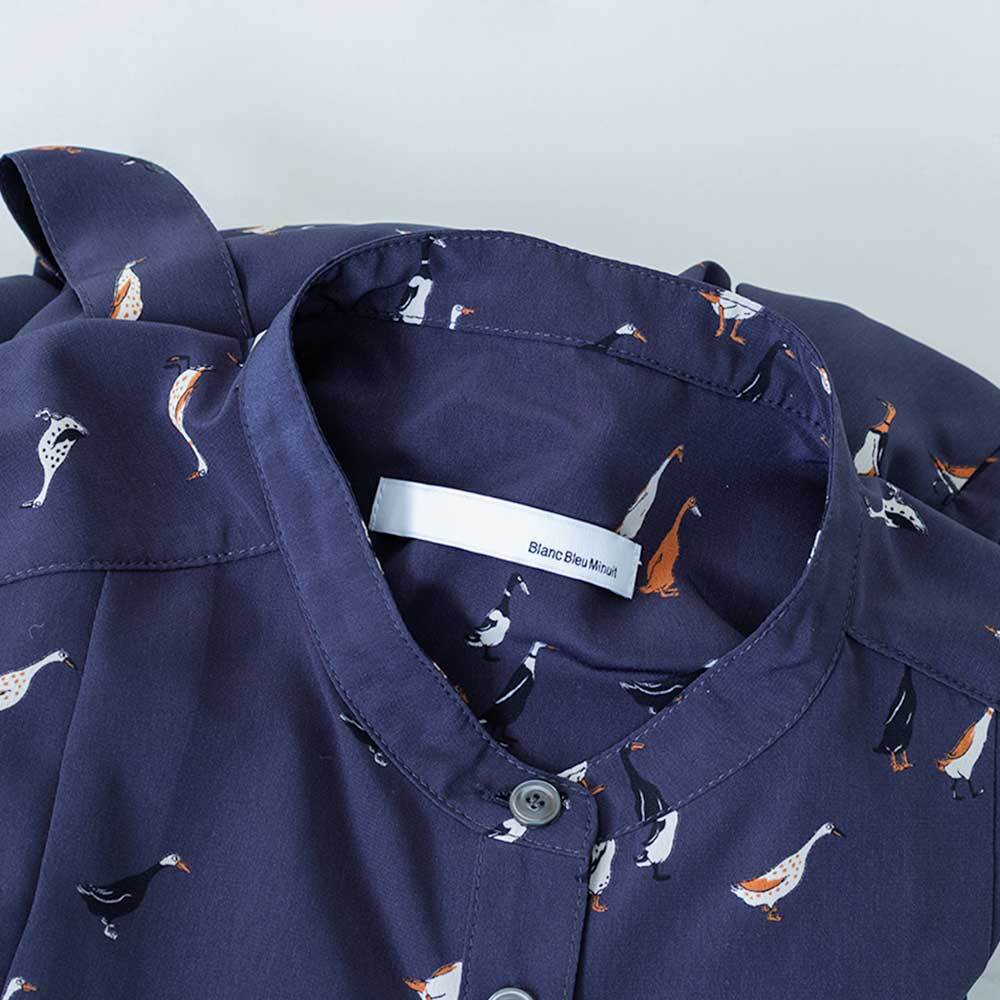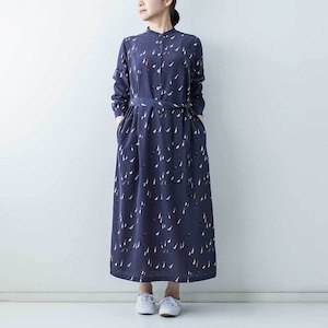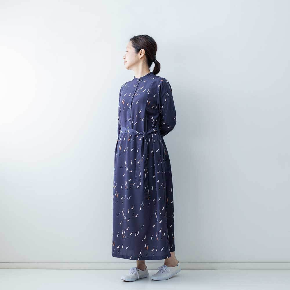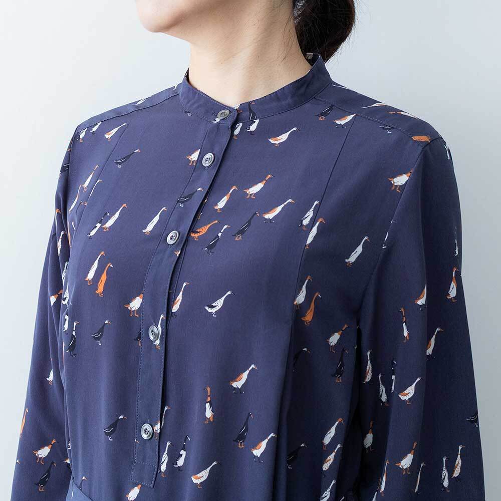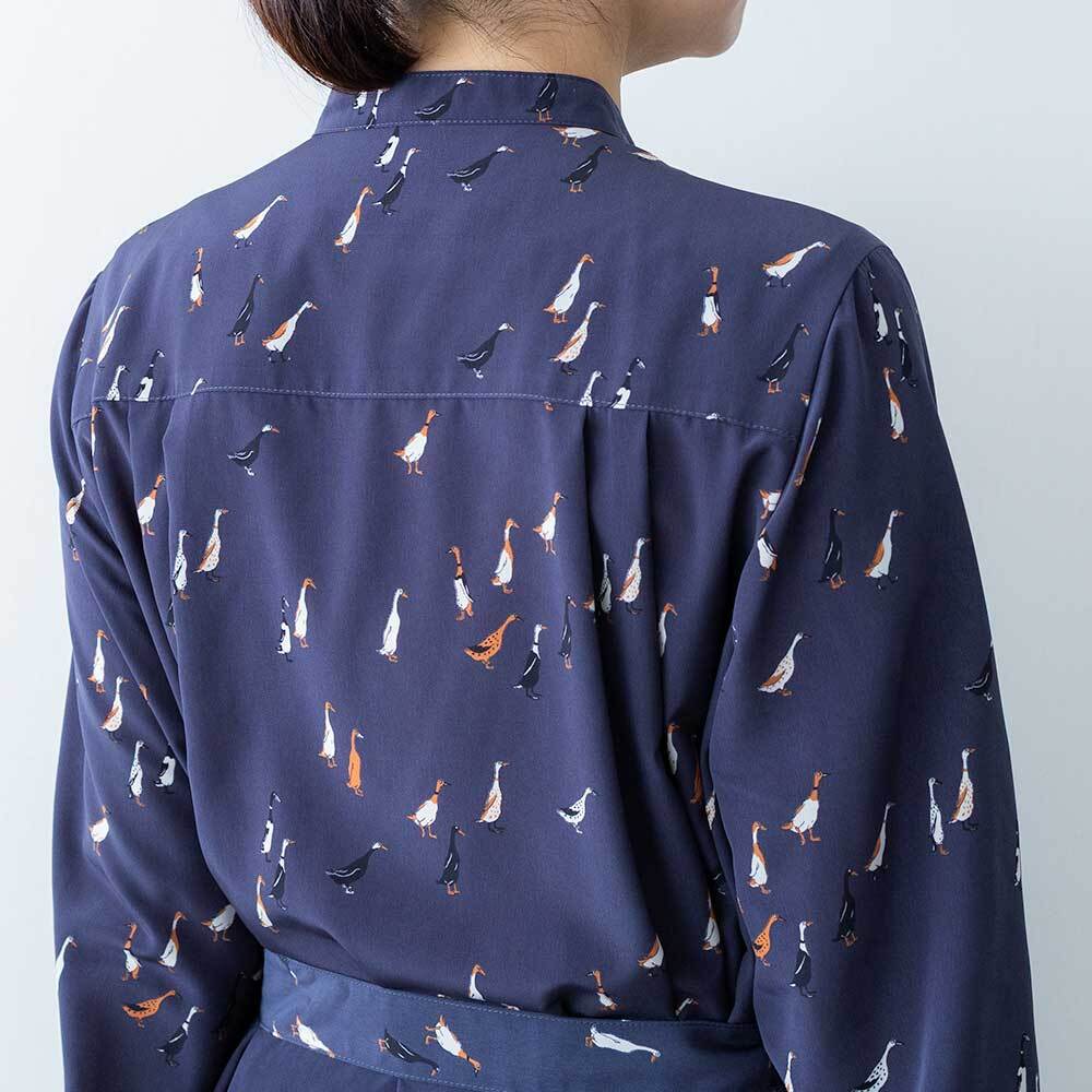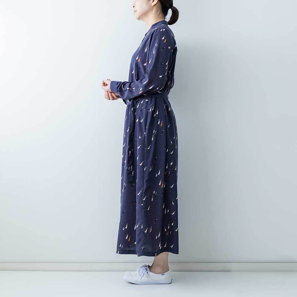 シックな色合いに、愛らしいアヒルモチーフを散りばめたブランドのオリジナルプリントのワンピースです。