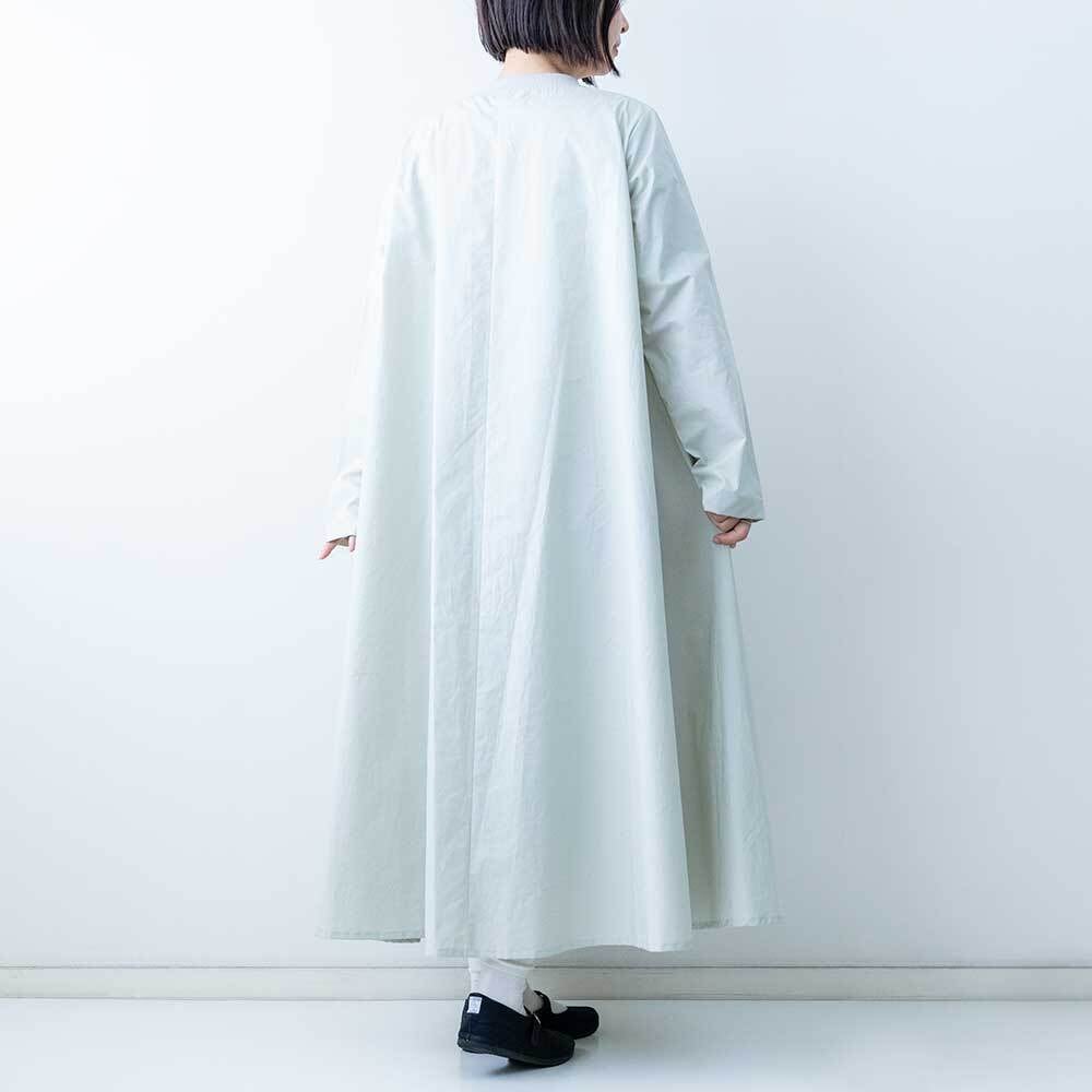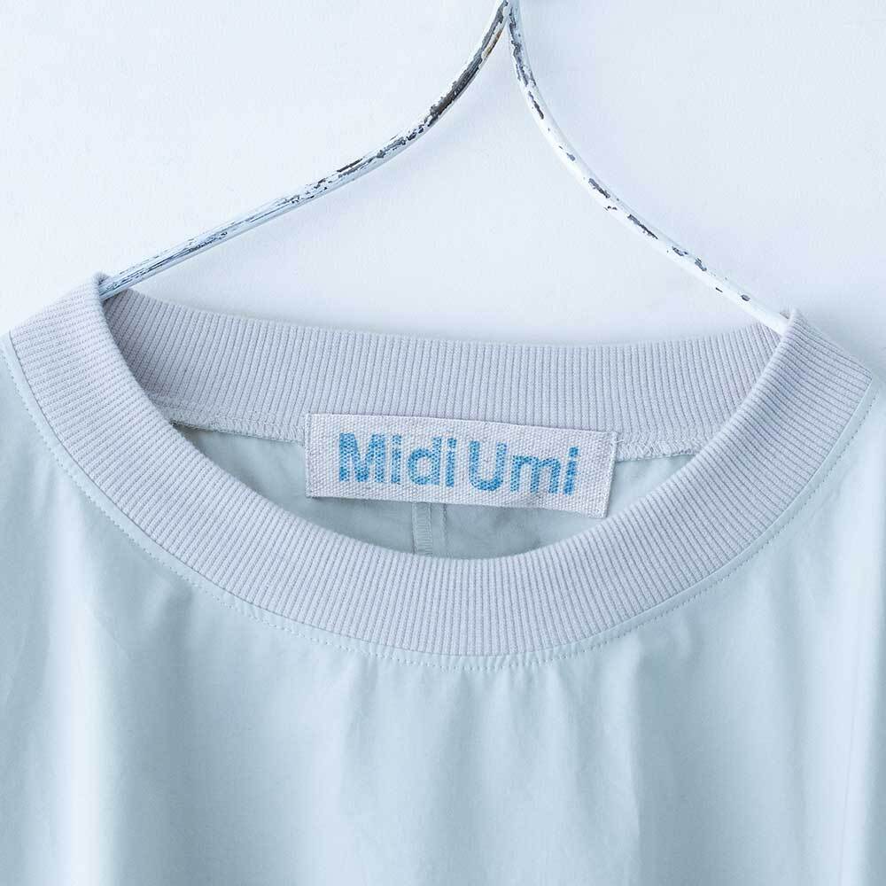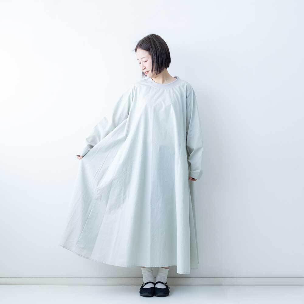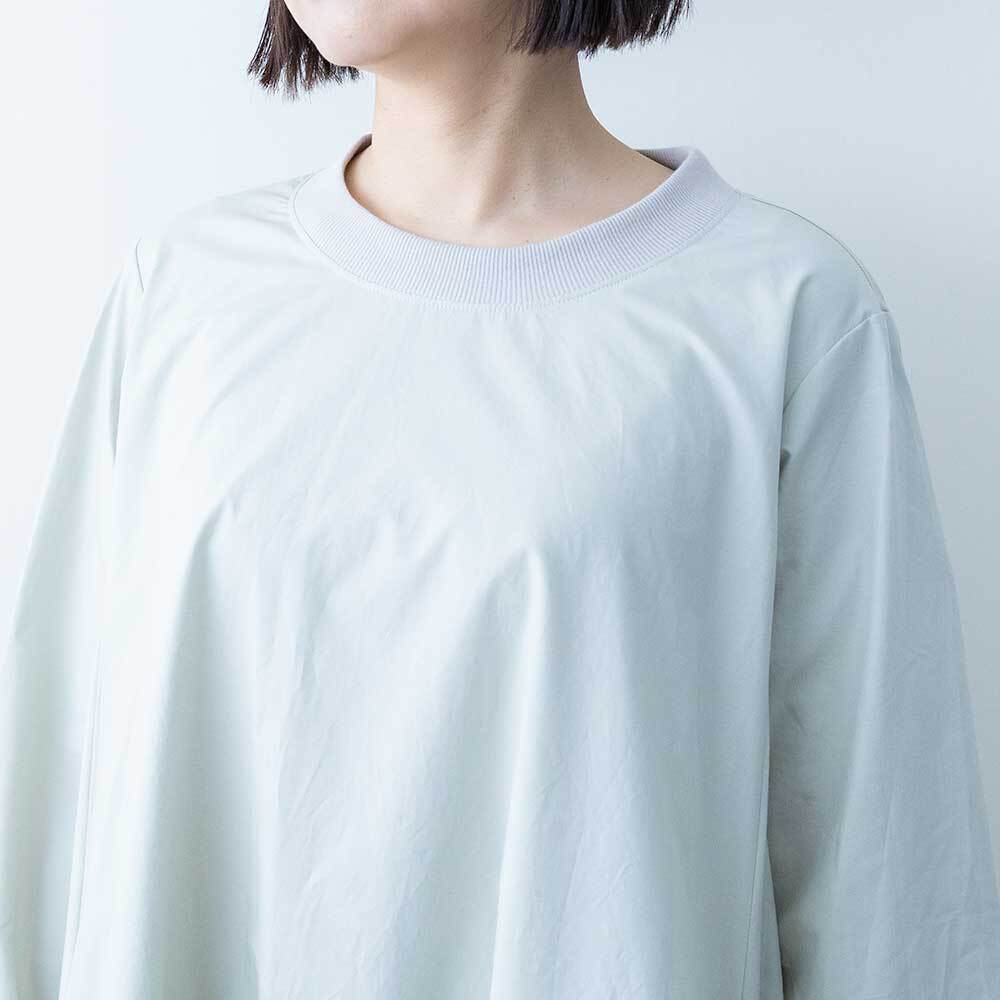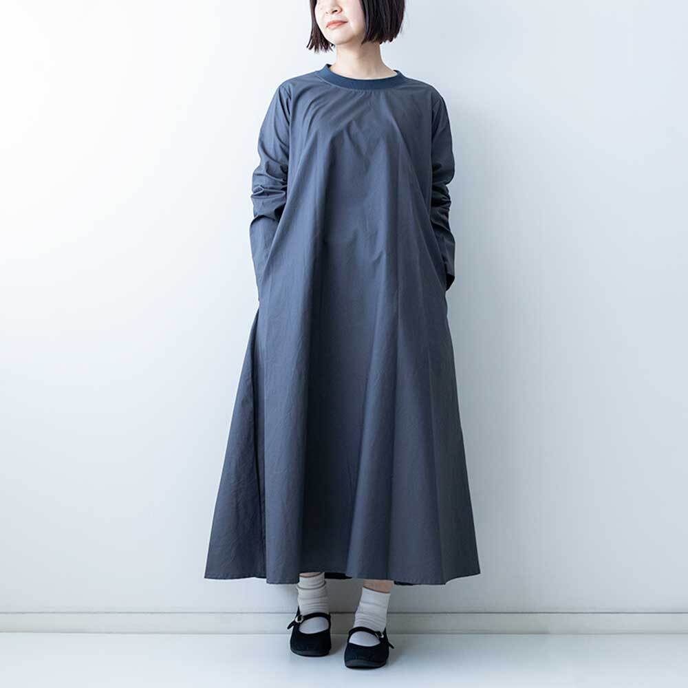 ハリがしっかりある素材で仕上げられており、Aラインに広がるきれいなフレアラインが特徴です。クルーネックの首元にはリブを施したデザインになっており、着脱がしやすいのもポイントです。