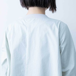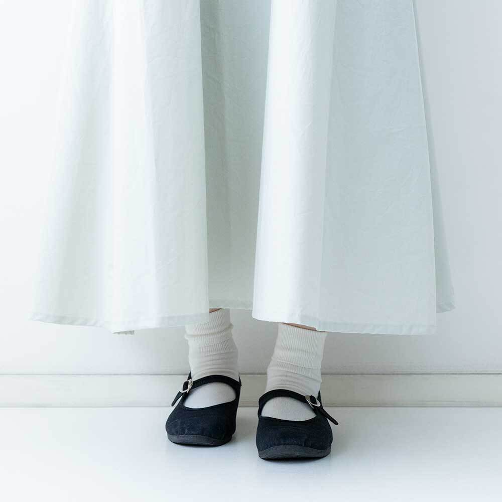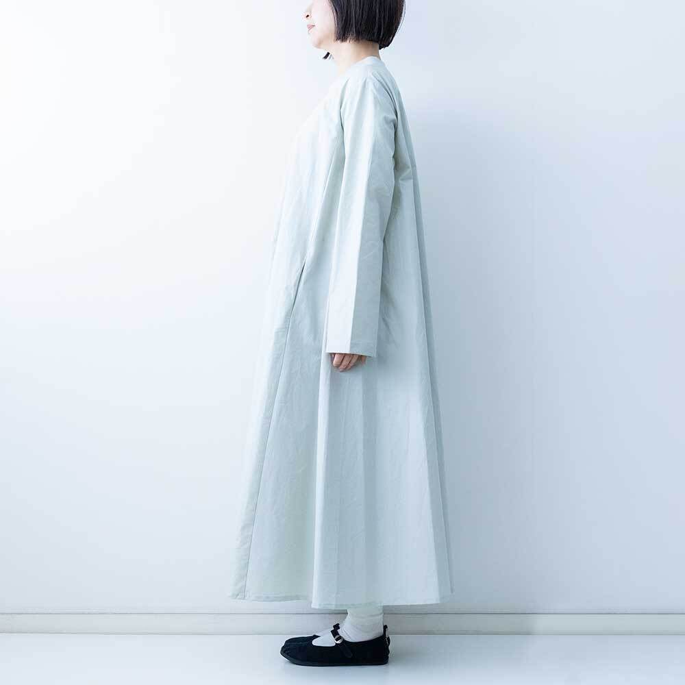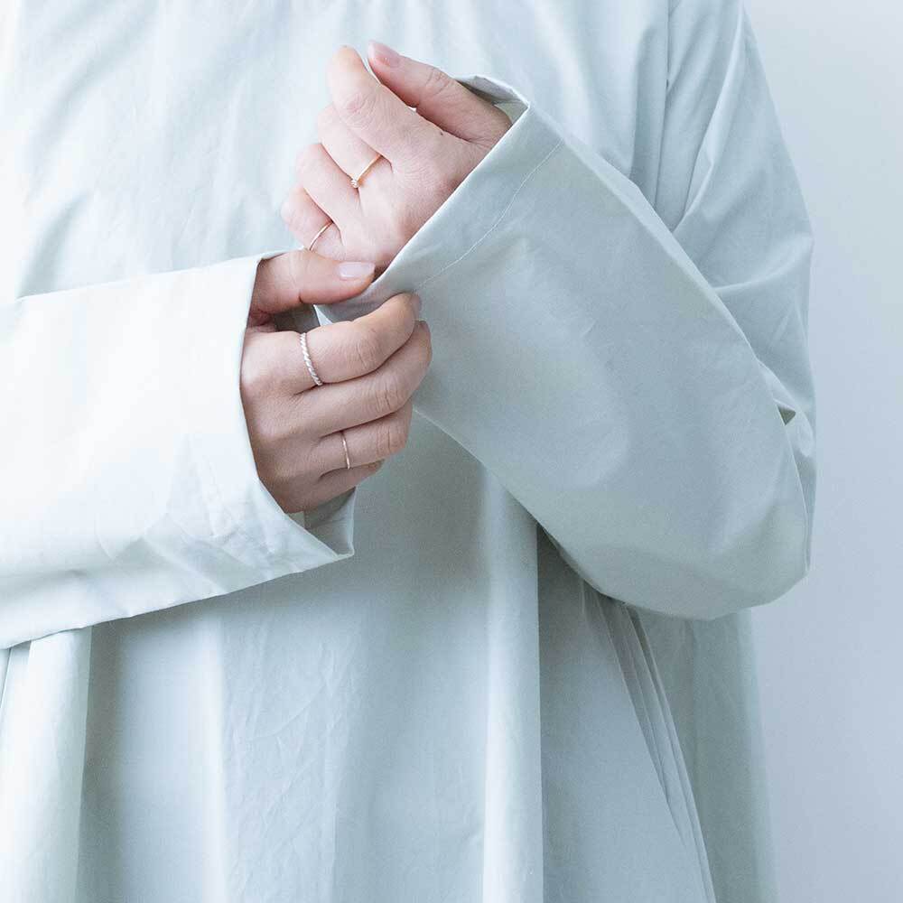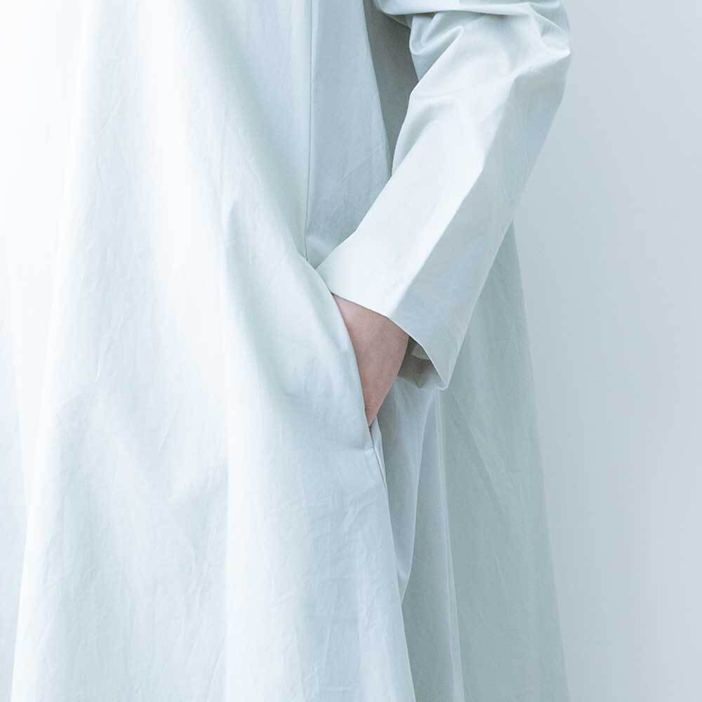 ハリがしっかりある素材で仕上げられており、Aラインに広がるきれいなフレアラインが特徴です。クルーネックの首元にはリブを施したデザインになっており、着脱がしやすいのもポイントです。