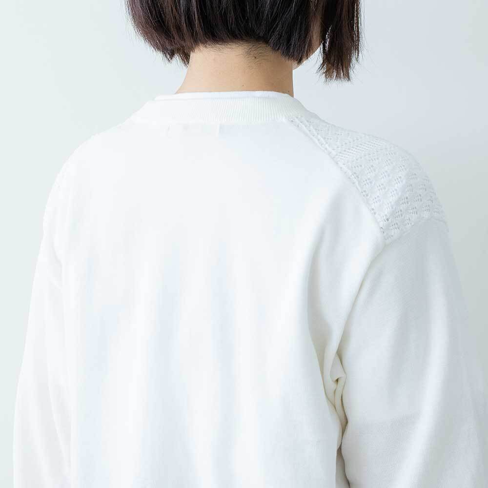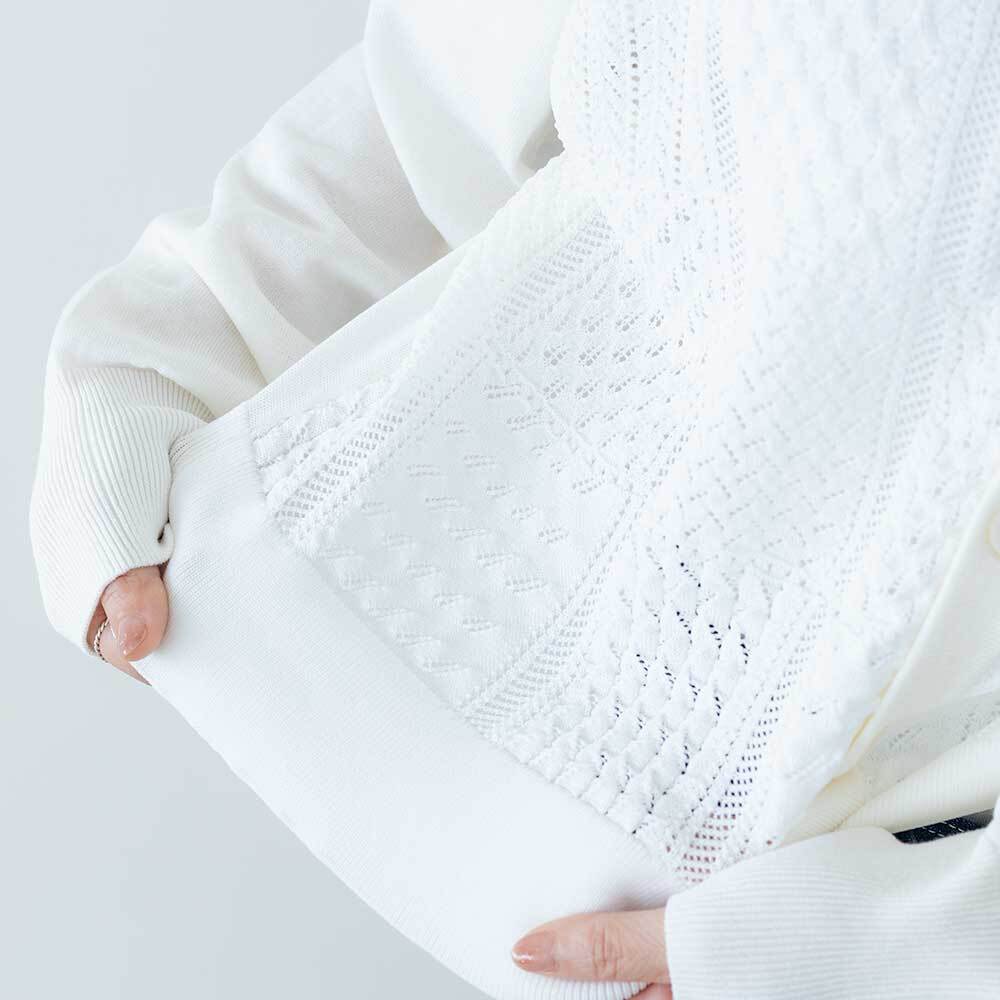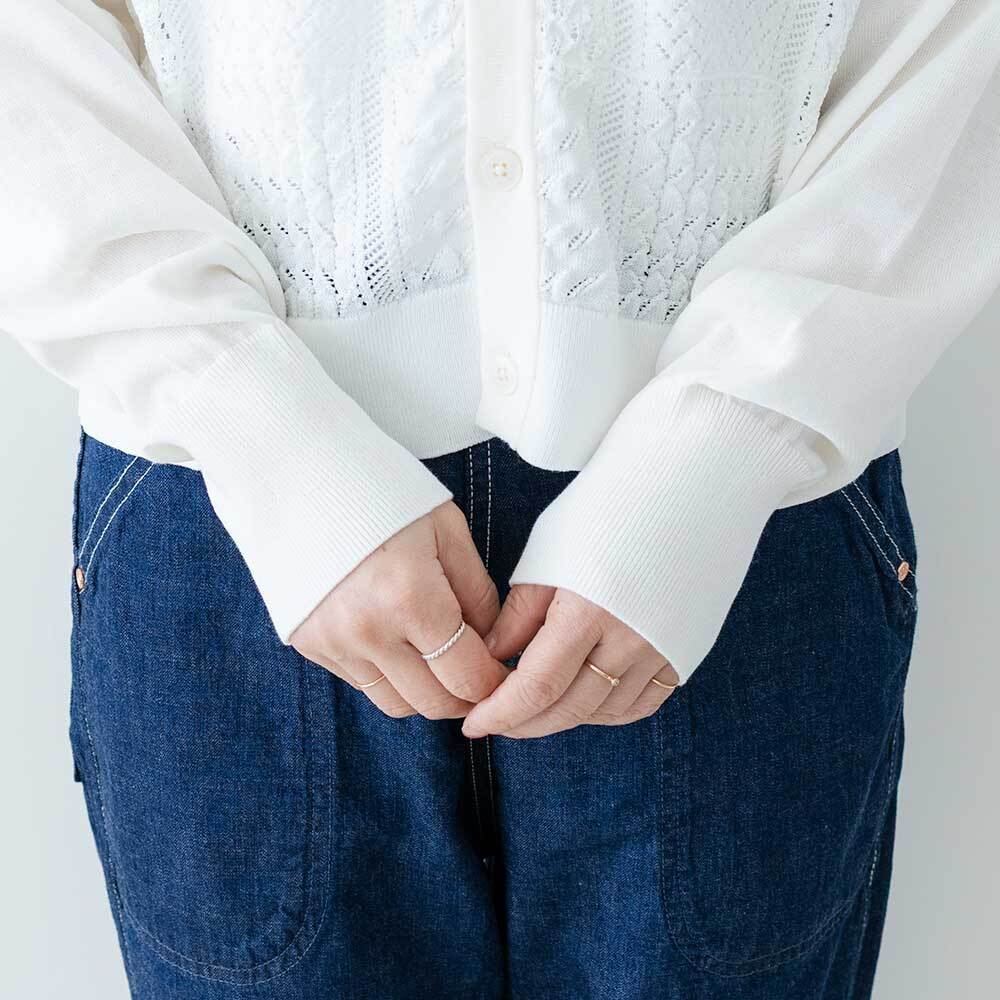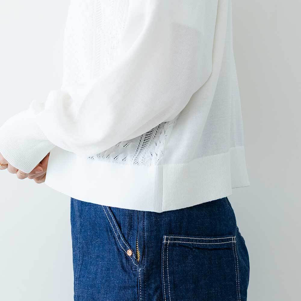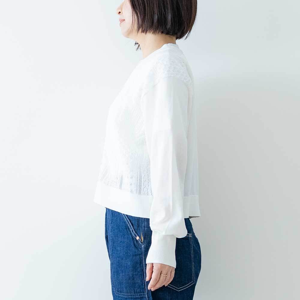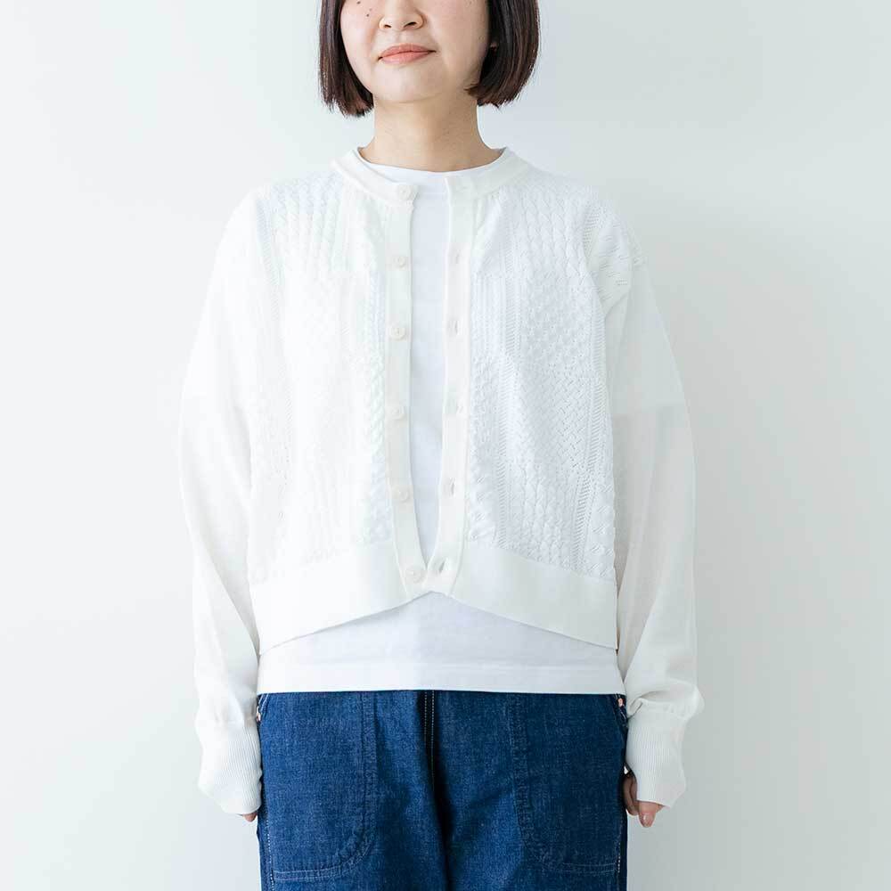 やわらかな透け感と編み模様が、コーディネートにさりげない表情をプラスする1枚です。