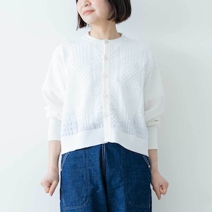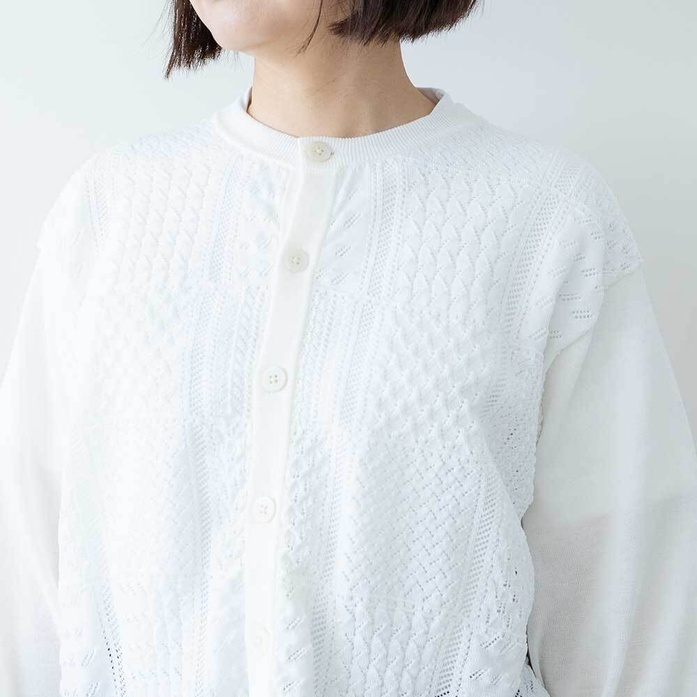 レースのような6パターンの模様編みを格子状に配置したカーディガンです。
