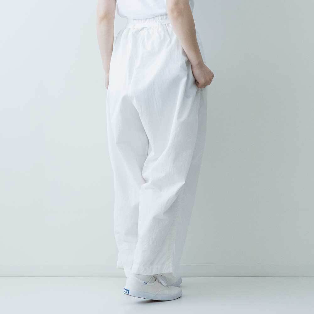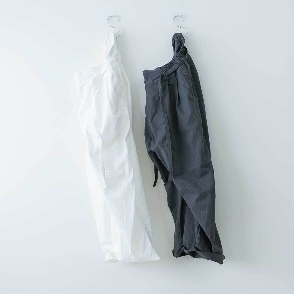 生地には遠州地方の職人による手作業の染めを施した綾目コットンを使用しており、オーガニックコットン特有の凹凸感と、製品染めならではの奥行きのある色合いが魅力です。ウエストはゴムとドローコードで調節できるので、快適な穿き心地になっています。