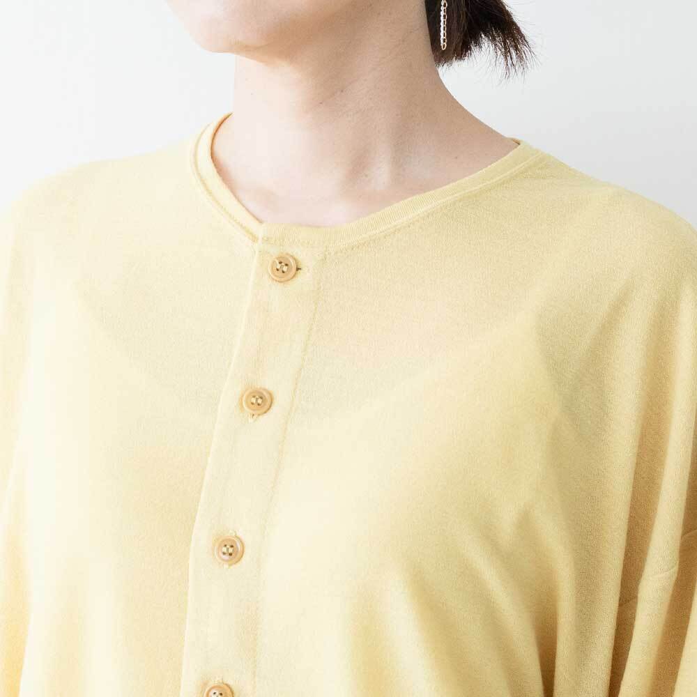 2021AWから継続の素材を使用し、今シーズンはクルーネックに変更した短めの丈のカーディガン。