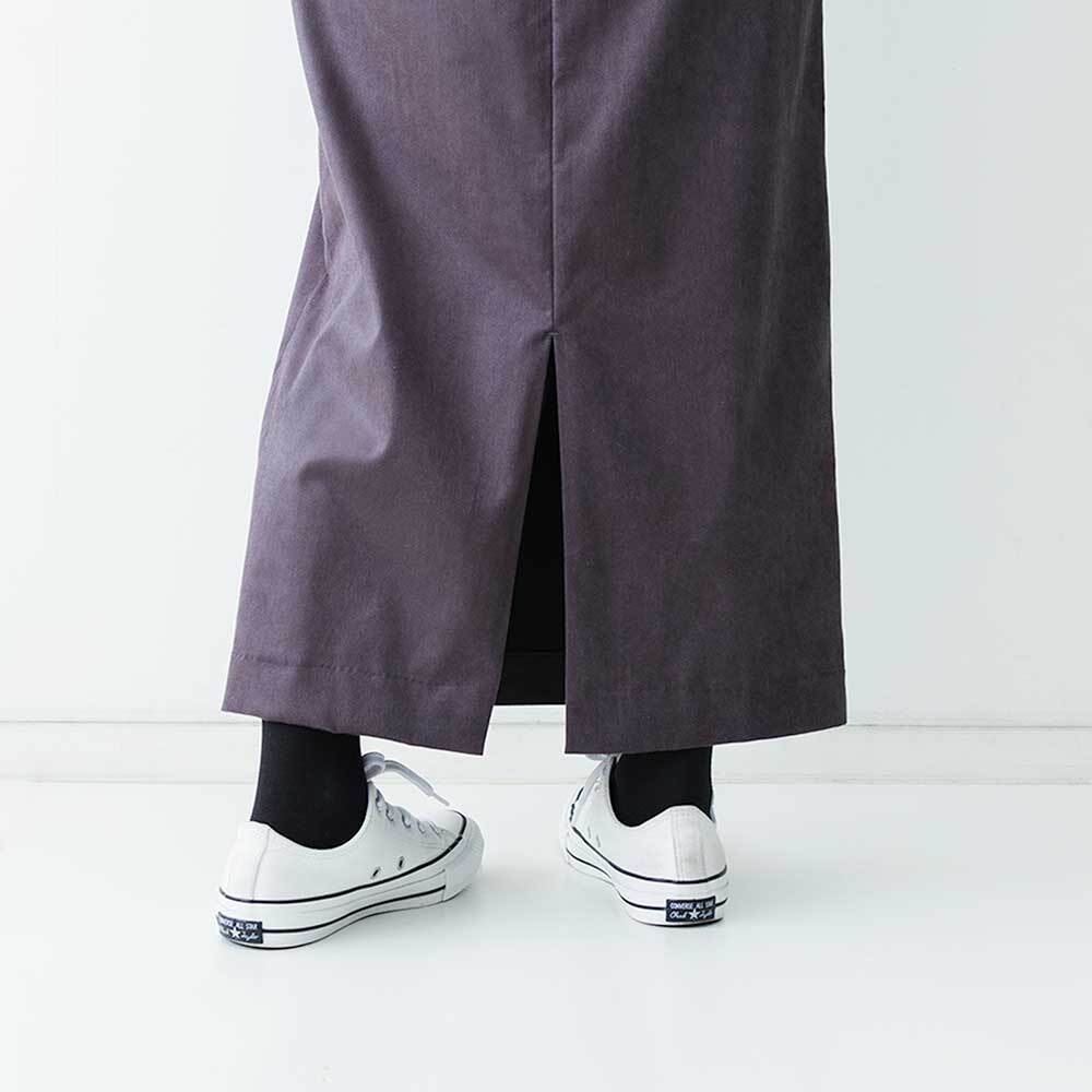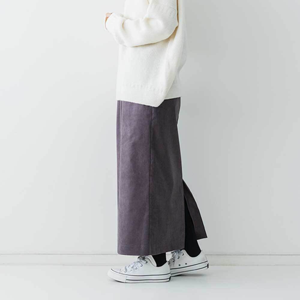 裾幅が細めなのでボリュームトップスを合わせてもバランスが取りやすく、腰回りをカバーしながらIラインコーディネートを楽しめます。