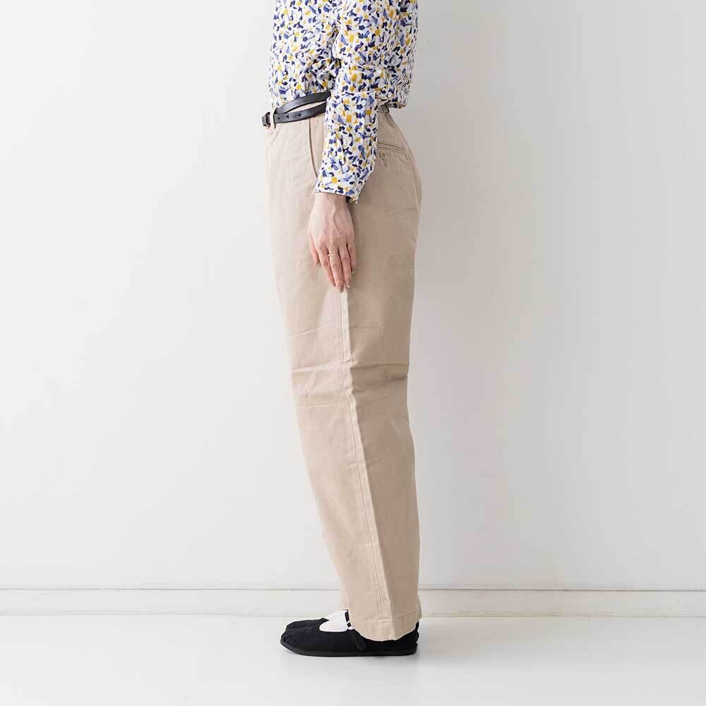 しっかりとしたチノクロスを使用し、腰回りはゆったりとしながらワイド過ぎず、ゆるやかテーパードラインは女性の身体を通すとちょうど良いストレートなシルエットを作ります。