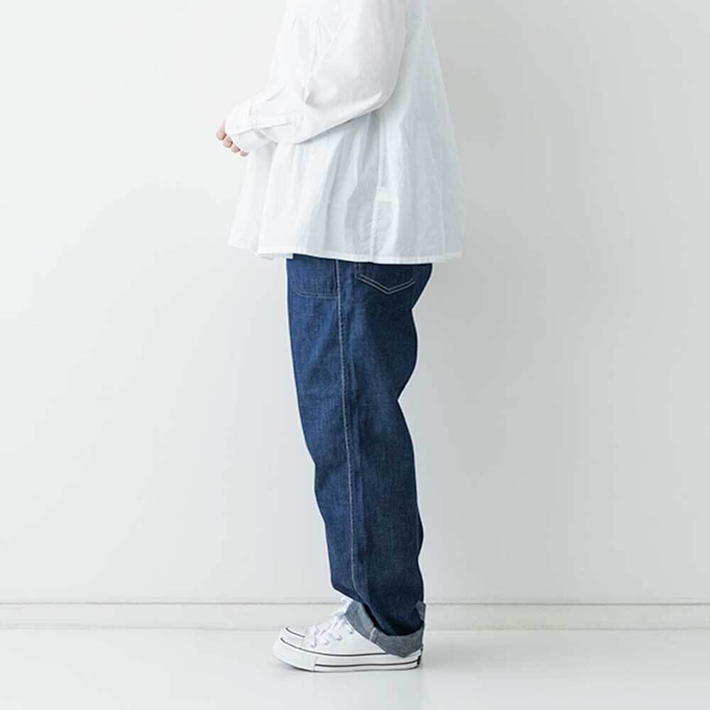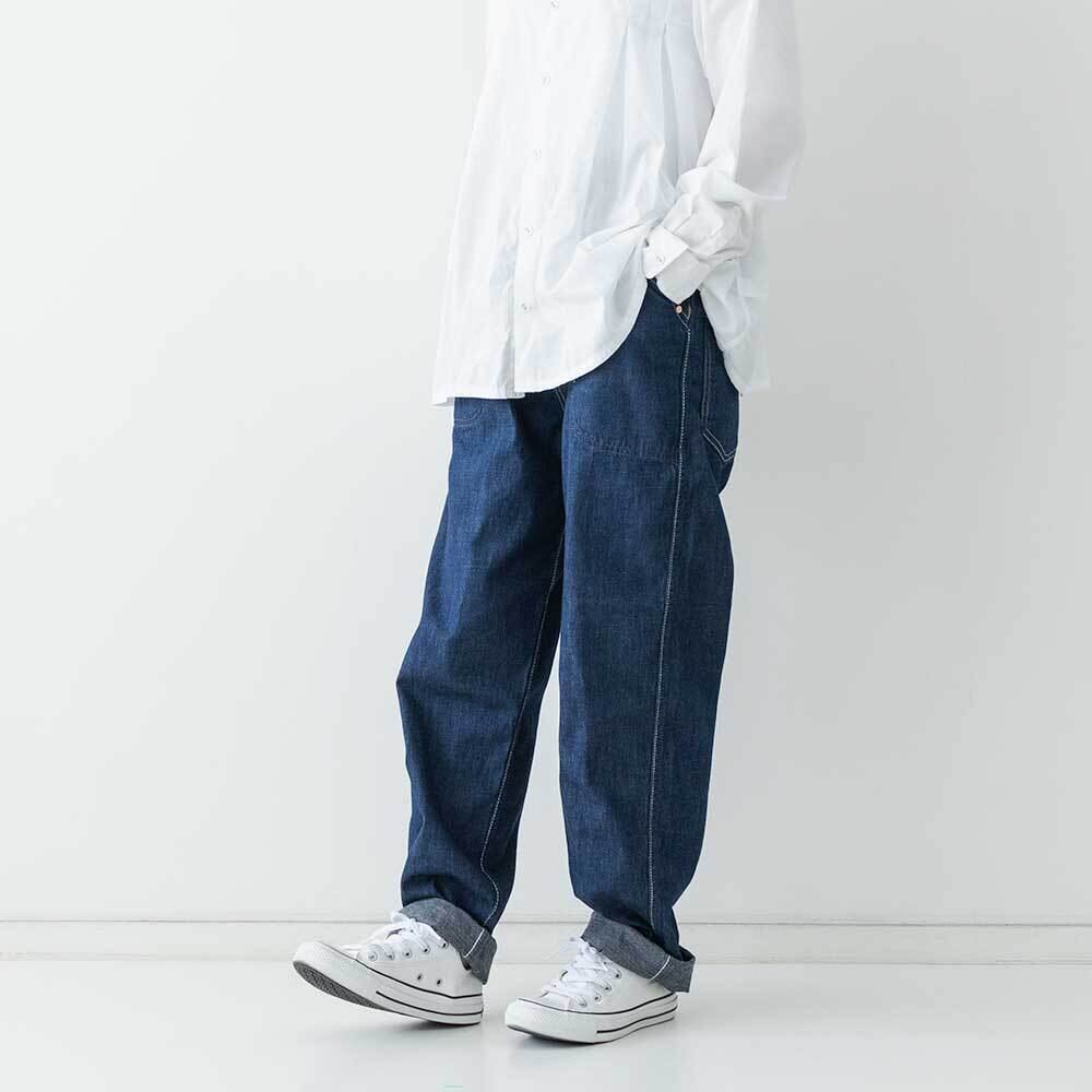 ワイドなワタリから裾に向かってテーパードさせることで、ワークテイストな中にも女性らしいシルエットに仕上がっています。
