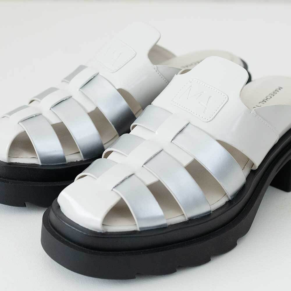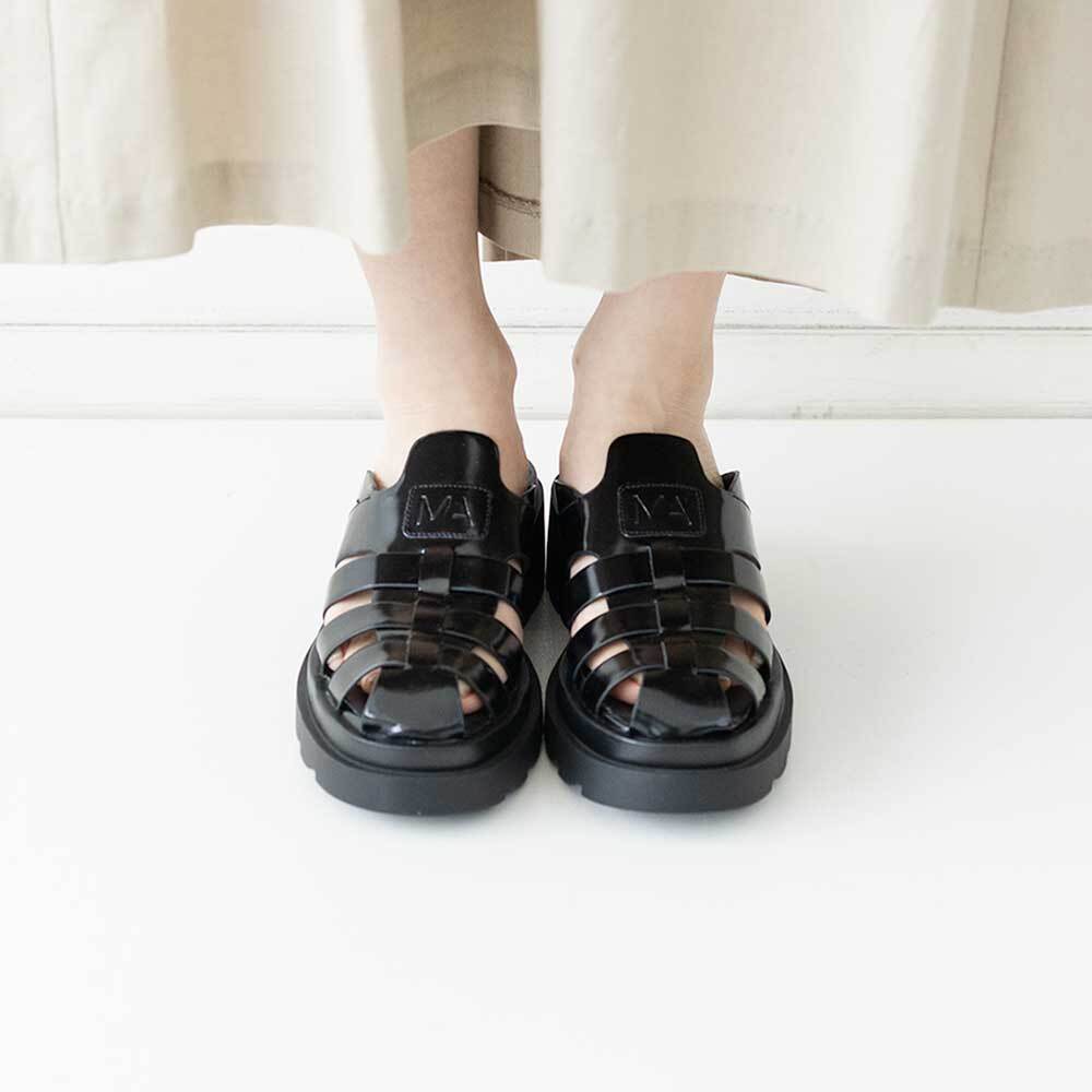 アッパーにはツヤのあるガラスレザーを使用し、中央にはブランドネームの頭文字「MA」の型押しロゴパッチがワンポイントになっています。