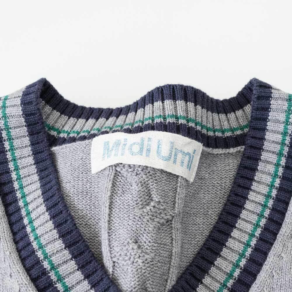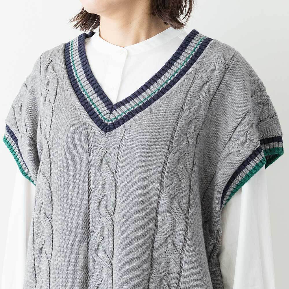 Vネックの襟元や、袖に施された数本のストラップ柄の配色使いがポイント。