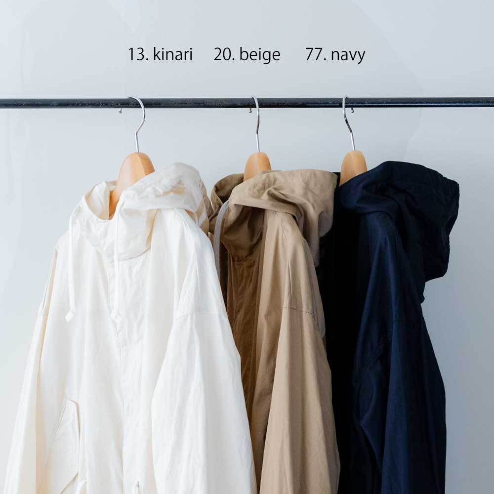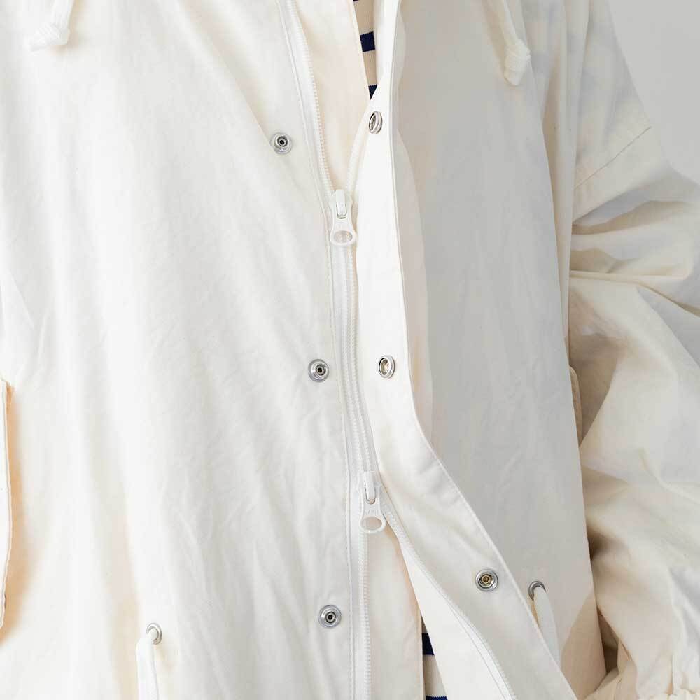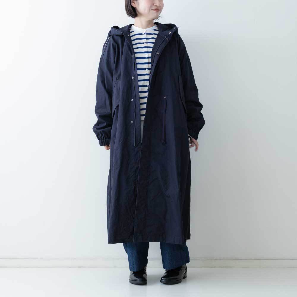 高密度なコットンウェザーを使用したフード付きロングコート。