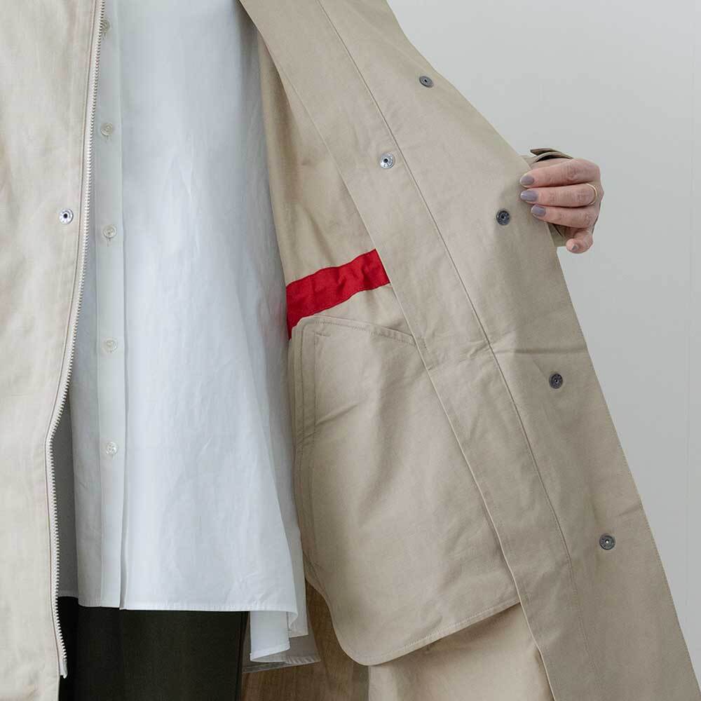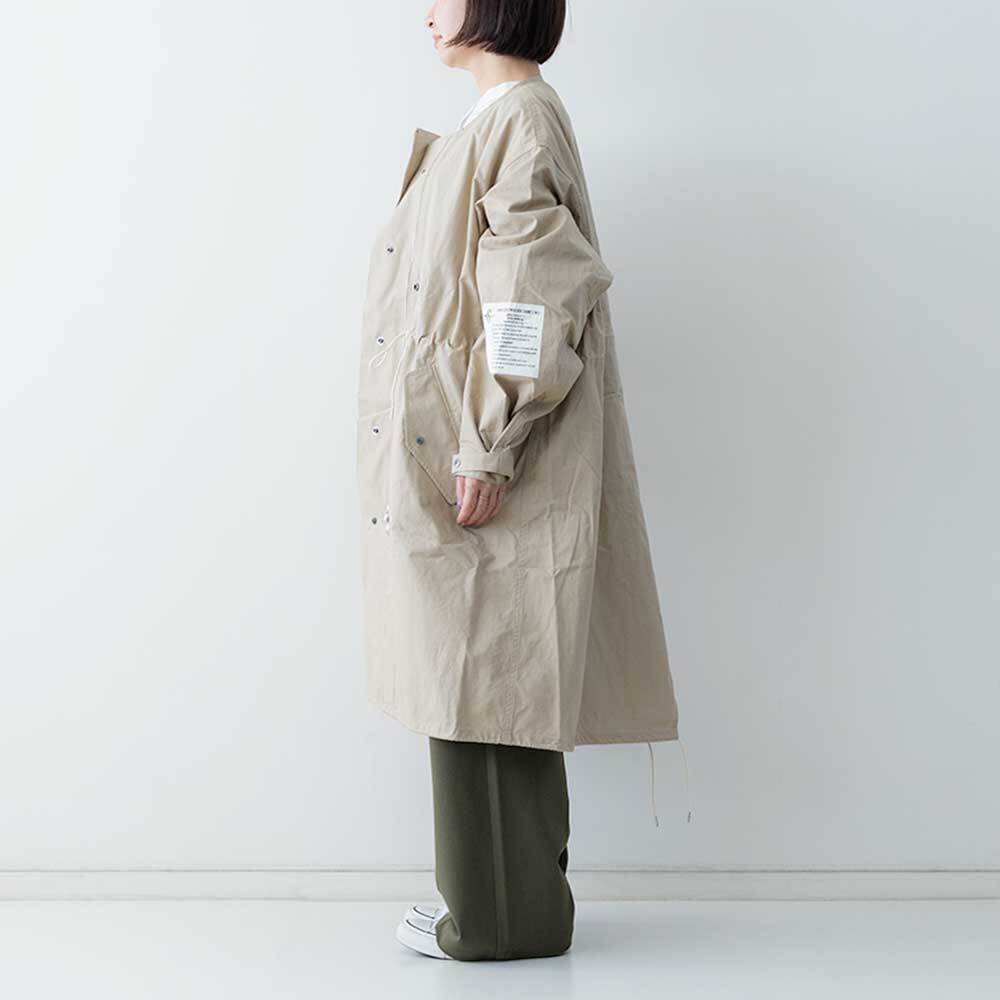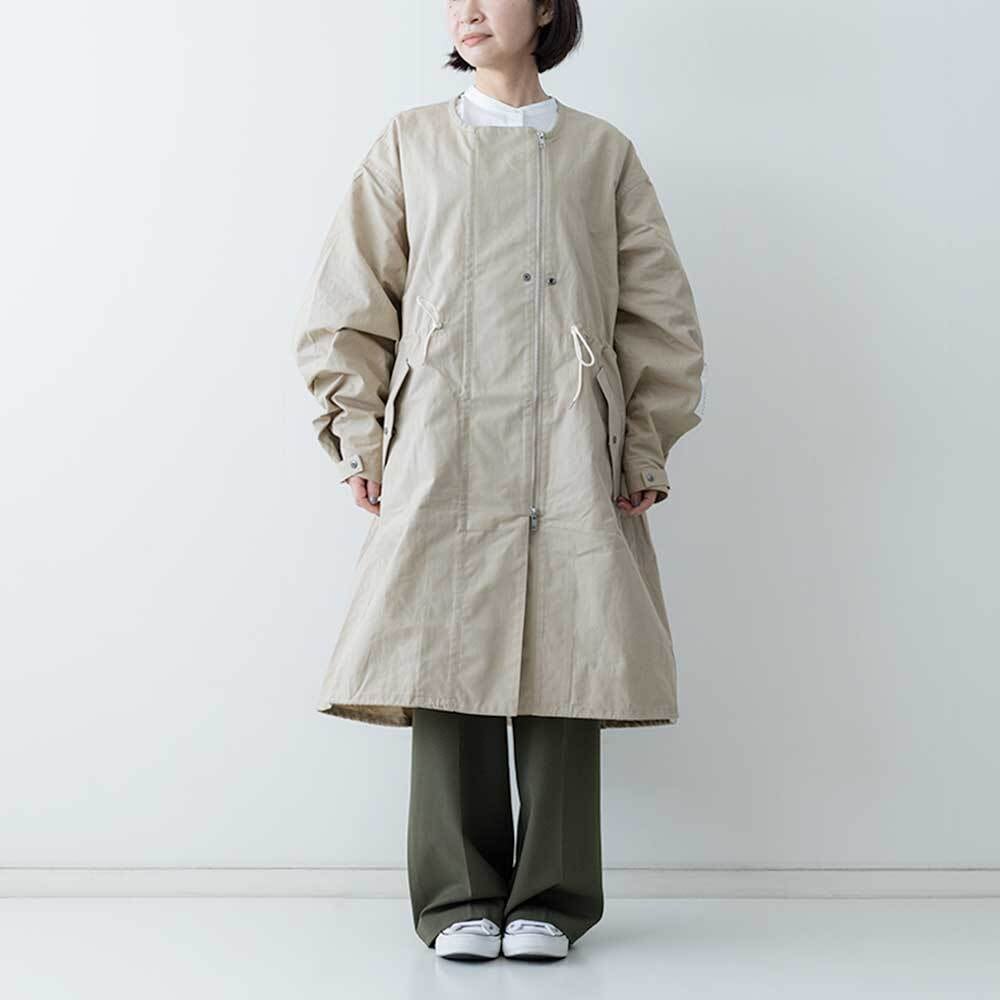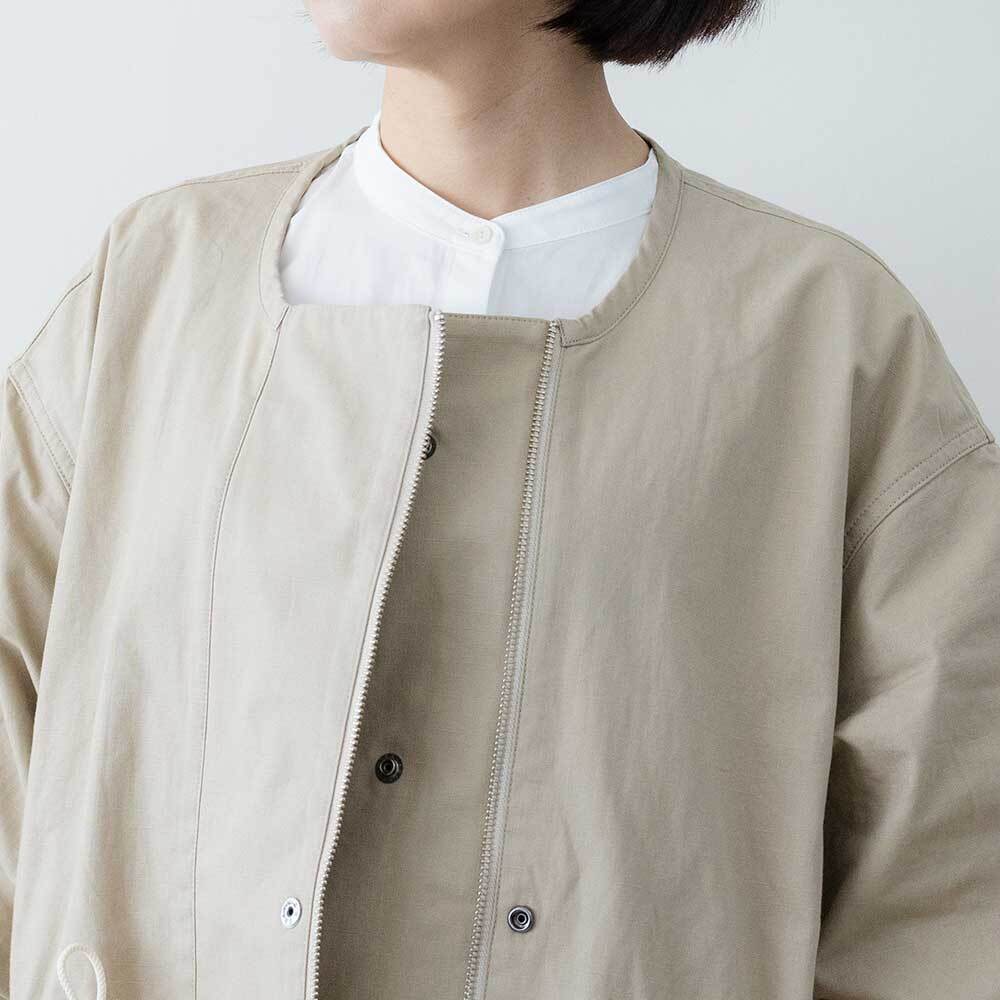 襟元はフード合わせやストールでのアレンジもしやすいノーカラーに。