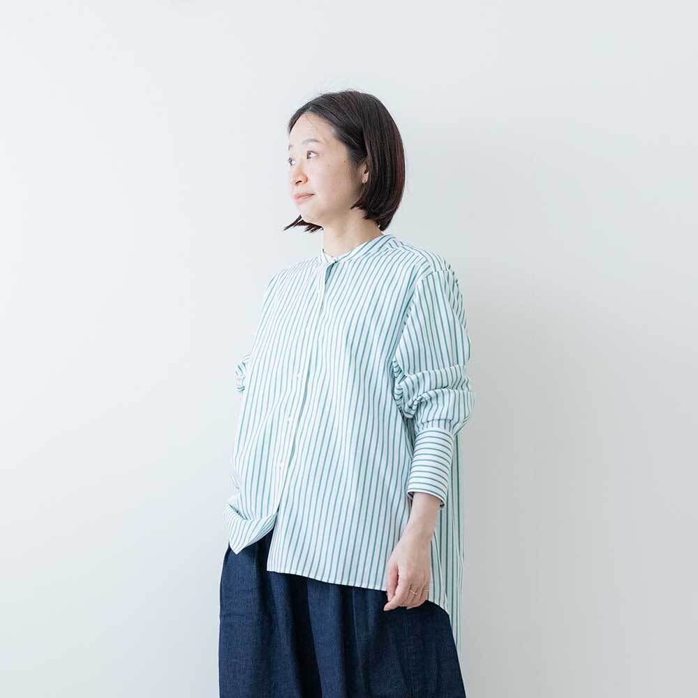 MidiUmi定番のタイプライターを使用したストライプボリュームスリーブシャツ。
