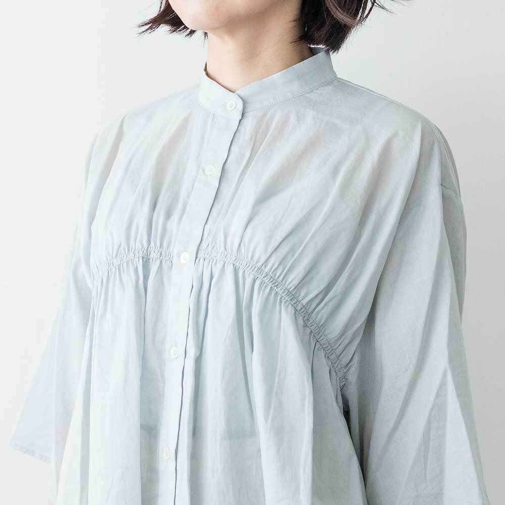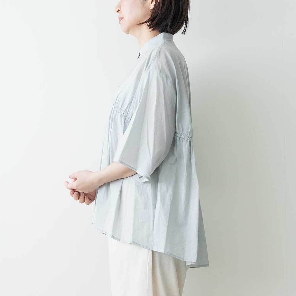 清涼感のある夏らしいローン素材を使用したシャーリング5分袖シャツ。
