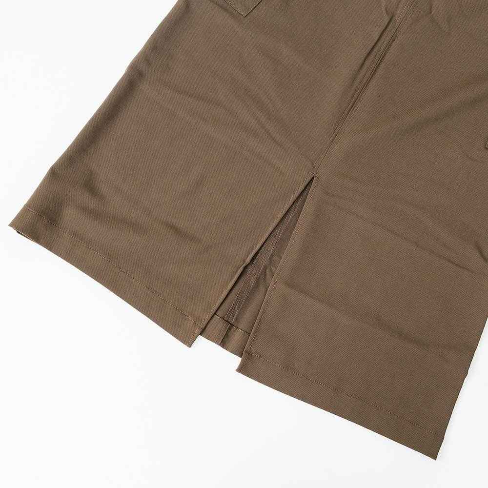 肩紐と後ろ脇ボタンでサイズ調整が可能で、後ろ裾にはスリットが入っているので足さばきも楽々。
