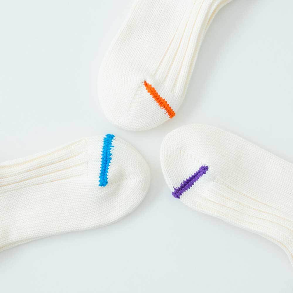 ヘビーウェイトのコットンソックス。 エクリュの優しい色合いにカラフルなボーダーラインがポイントです。