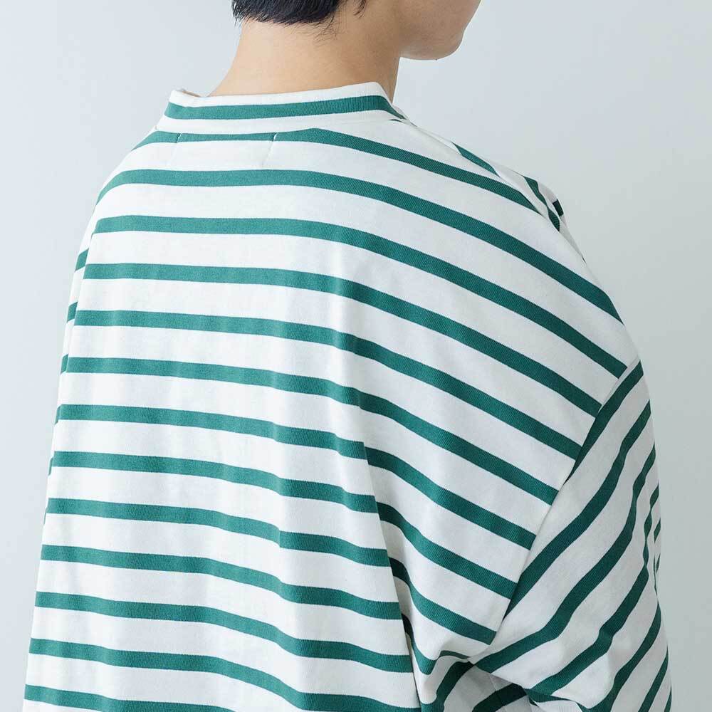 糸を引き揃えて編まれたボーダー天竺素材を使用した1枚です。前後差をつけたショート丈のプルオーバーなので中にシャツを合わせても可愛いです。