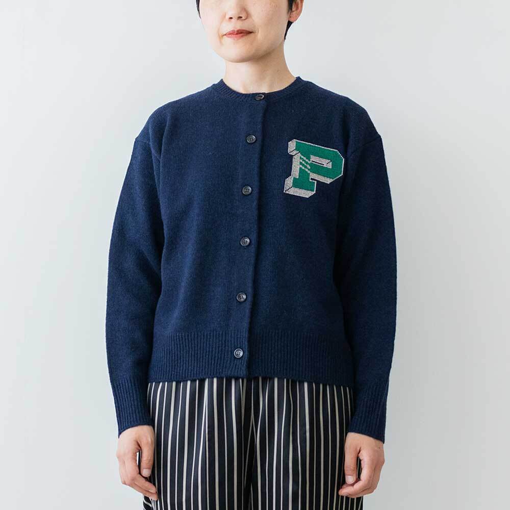 鮮やかなクロスステッチ刺繡で、フロントには「P(パロット=オウム)」のイニシャルを。