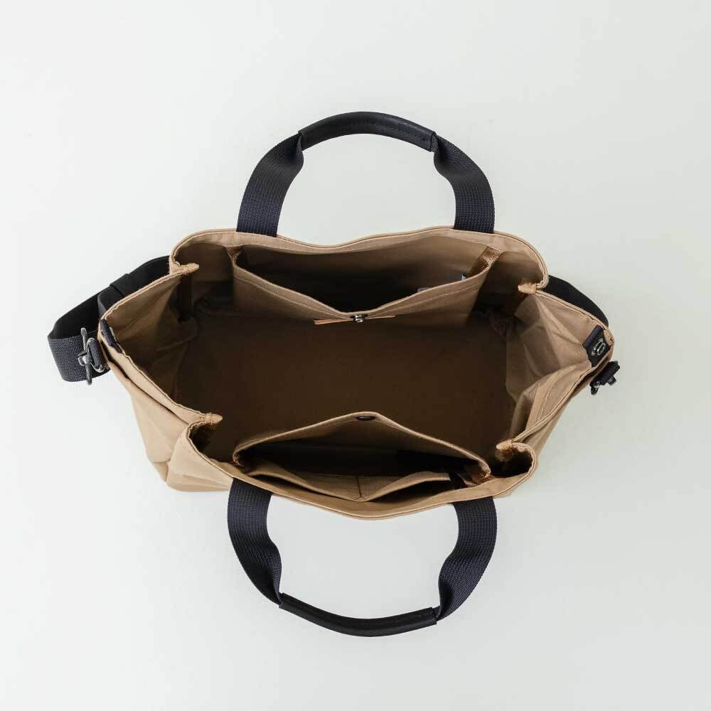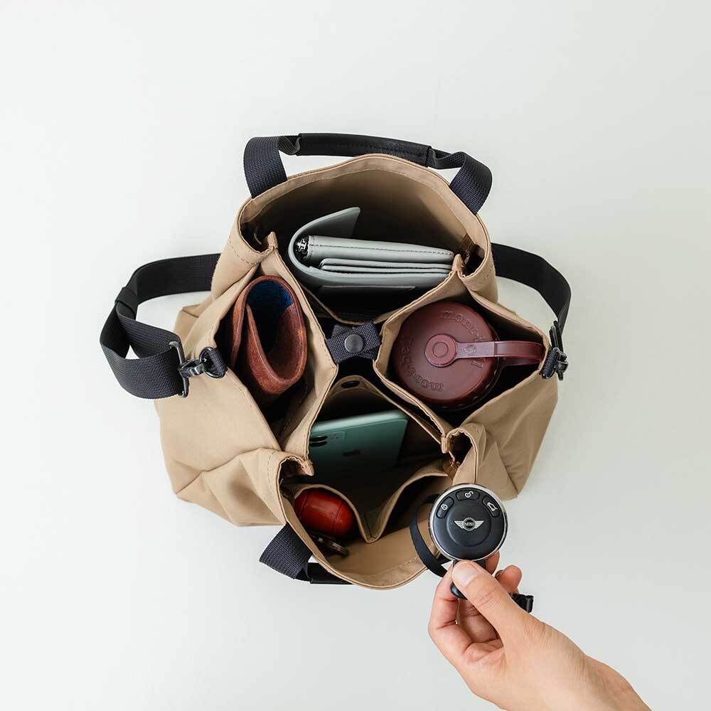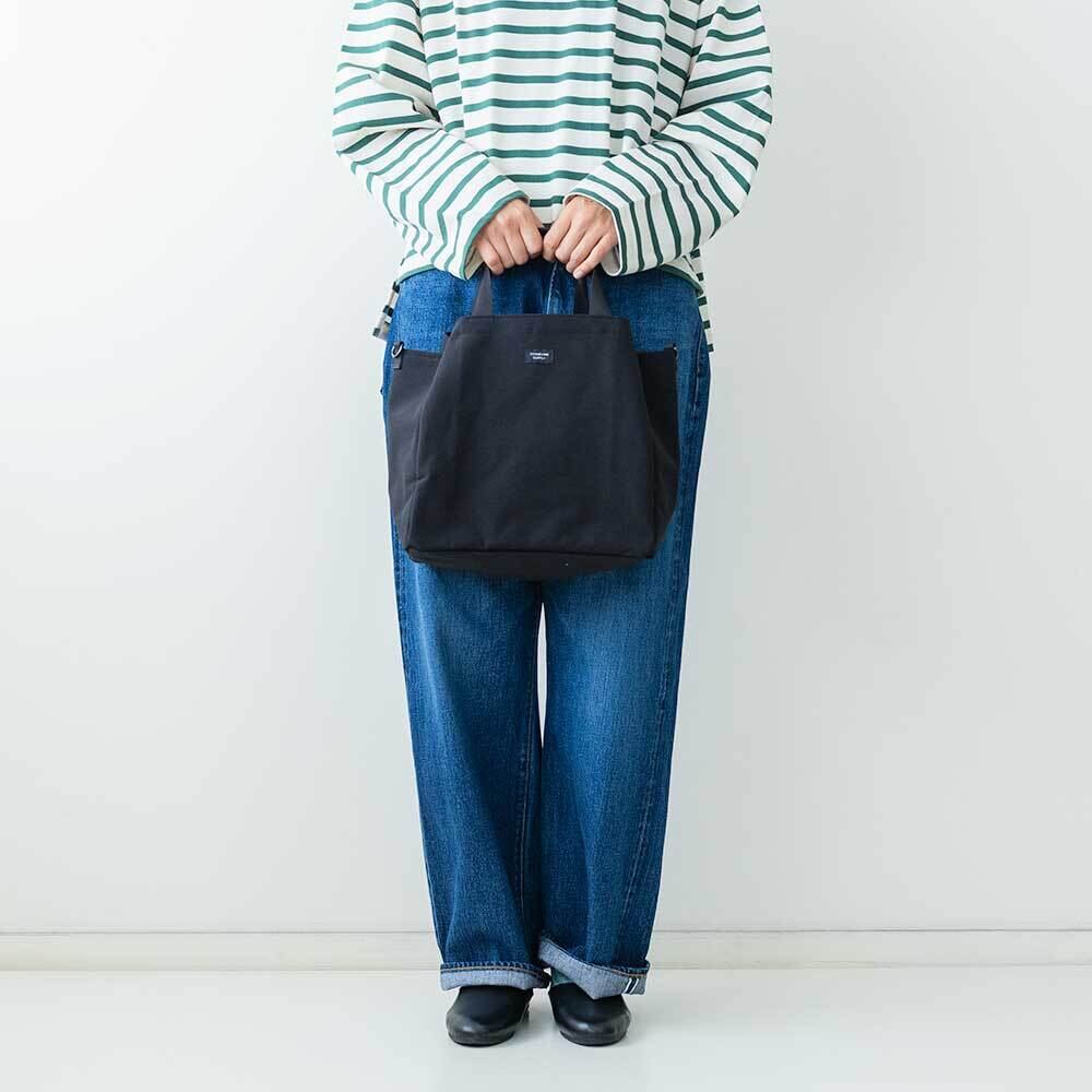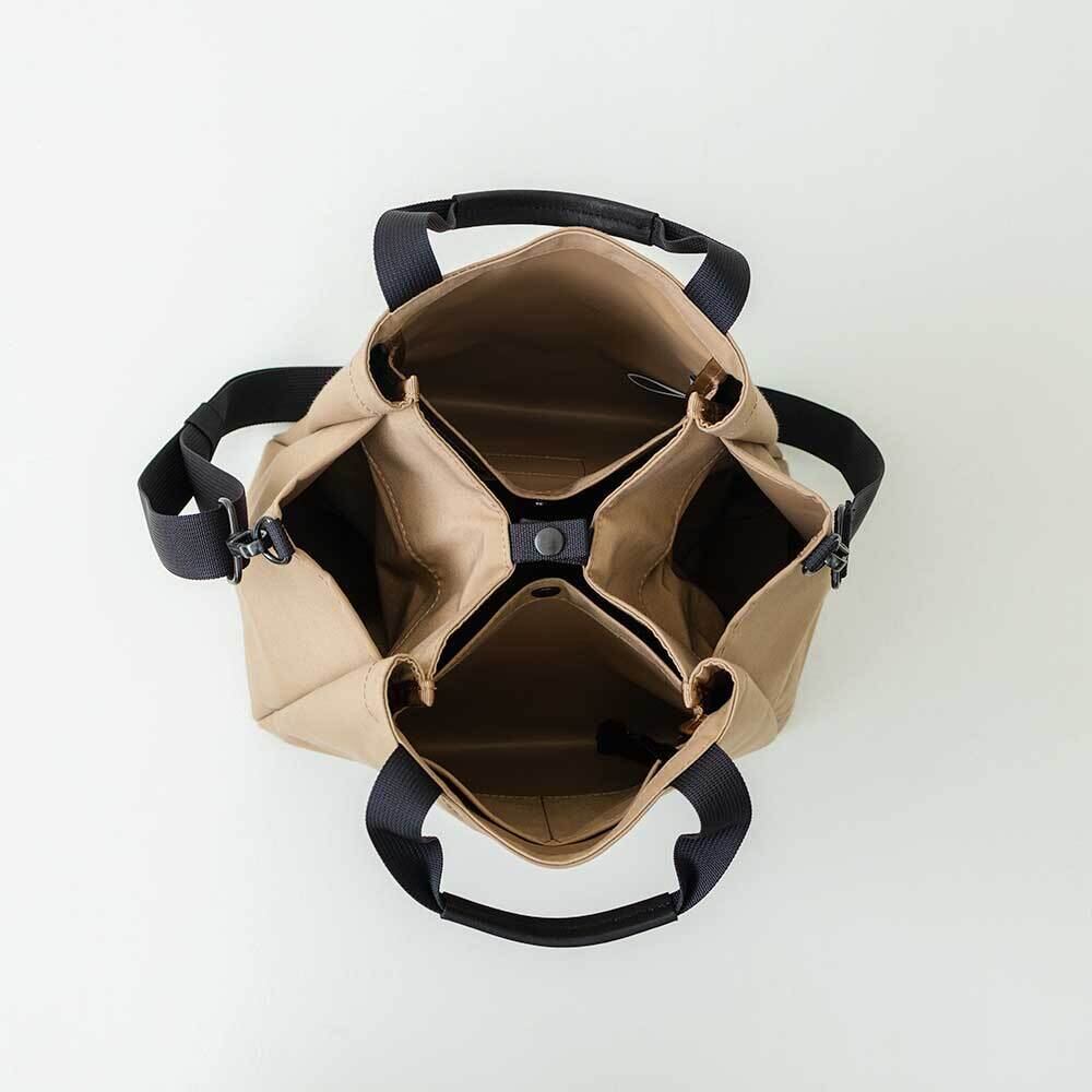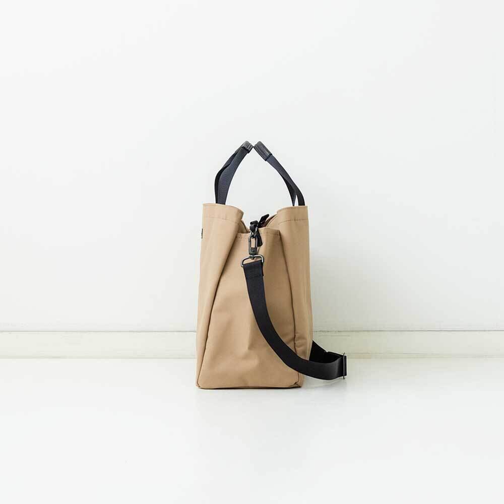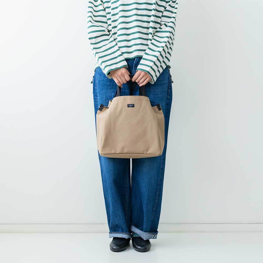 ホックをとめることで特徴的なシルエットになる2WAYトートです。