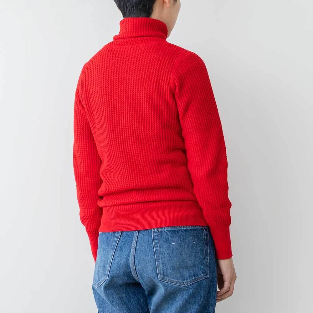 やわらかな風合いのコットン糸を使用し、ハイゲージのワッフル編みにしたタートルネックのプルオーバーです。