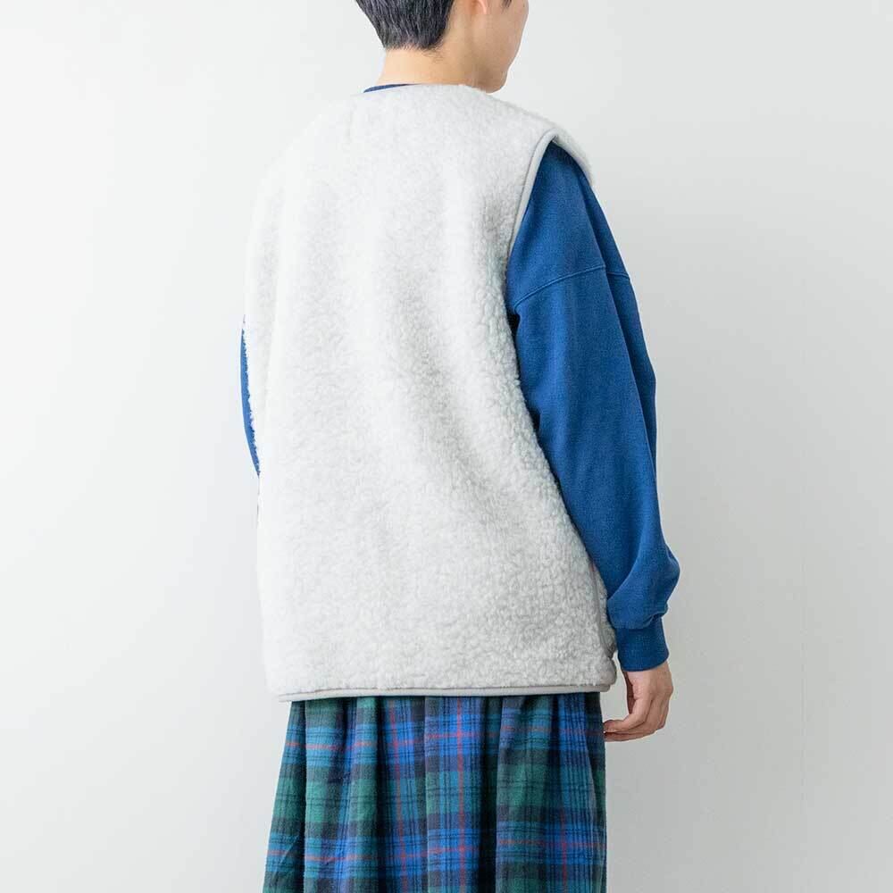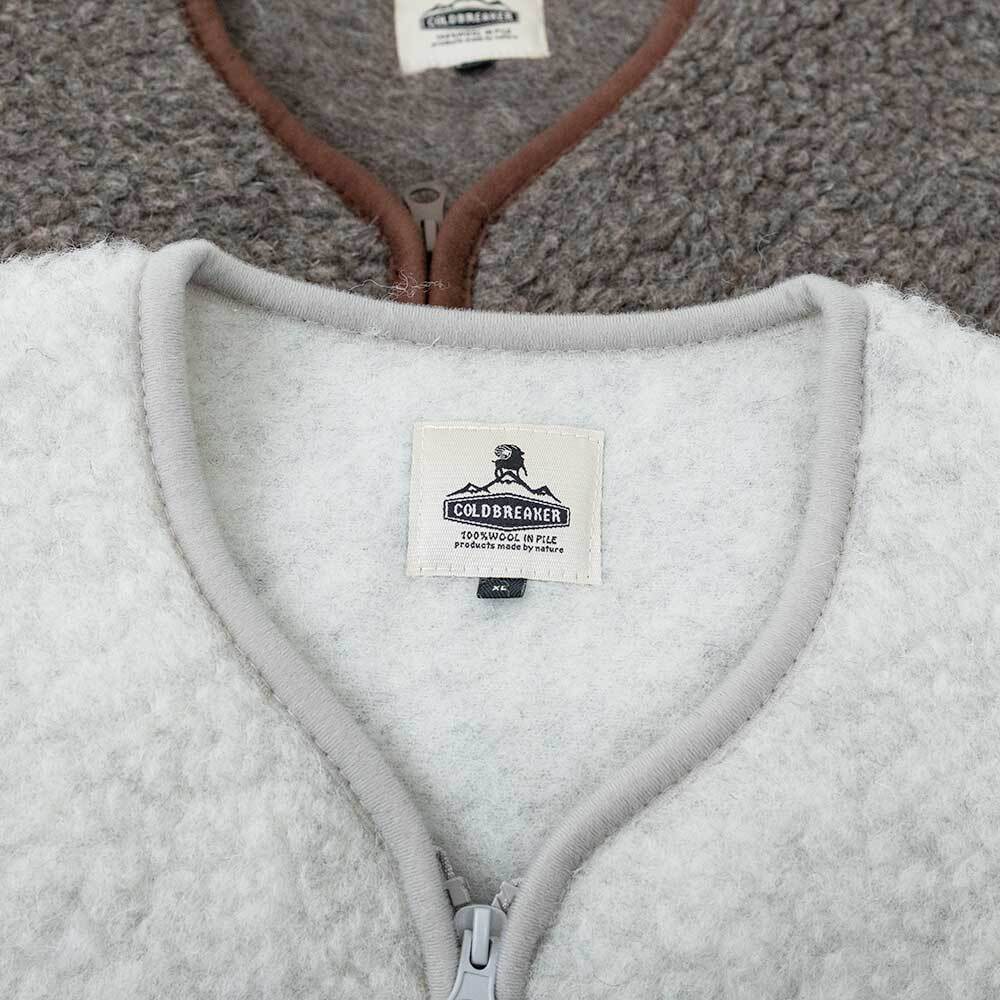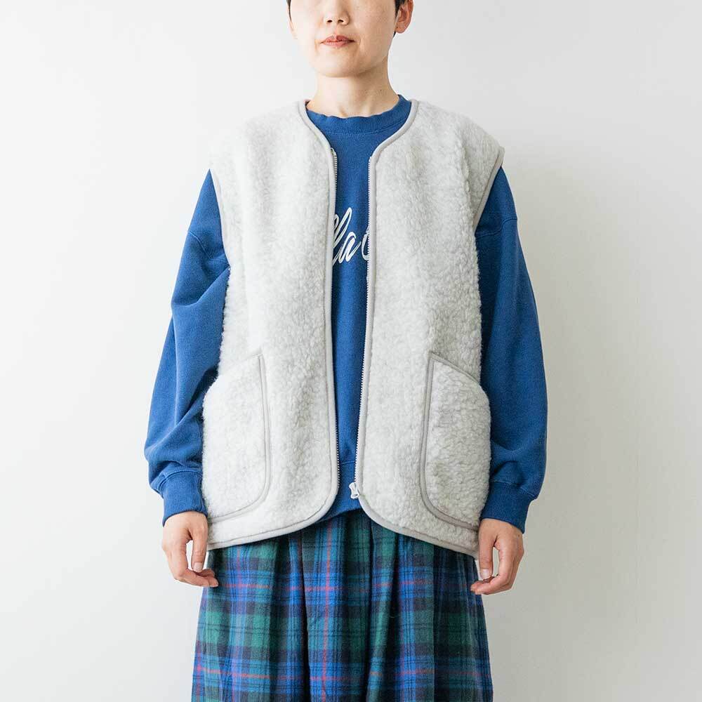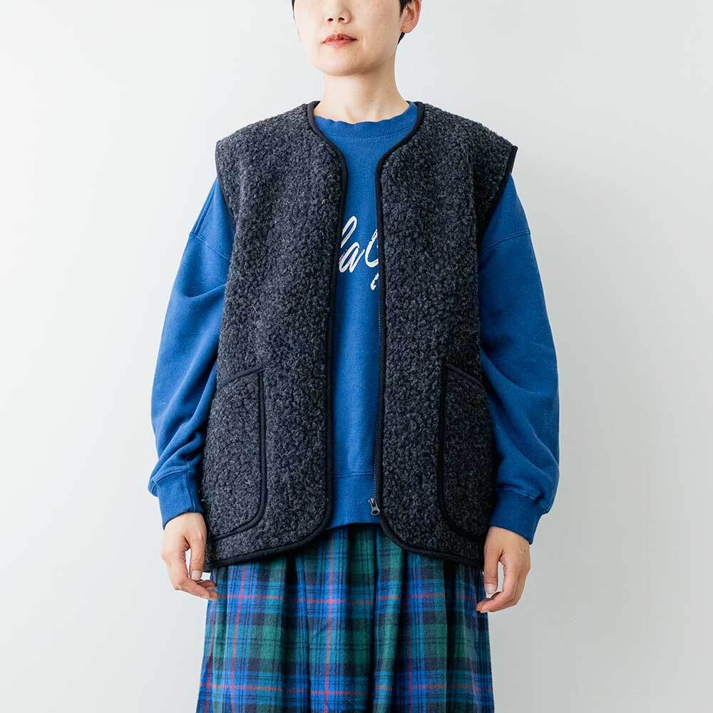 高品質のウール製品をウエアからルームシューズまで幅広く生産しているブランド、コールドブレイカ―のボアベストです。