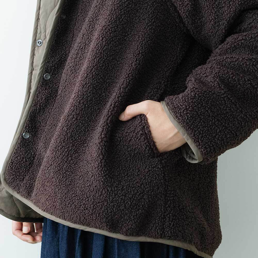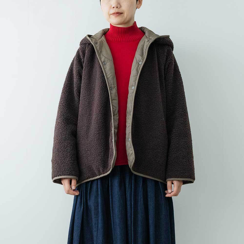 中と外で色と生地感を変えて雰囲気が異なるため、コーディネートによって着こなしを楽しんでいただけます。前後差付きの裾を表現し、スナップボタン仕様。軽くてあたたかいカジュアルコートです。