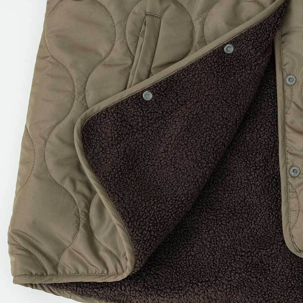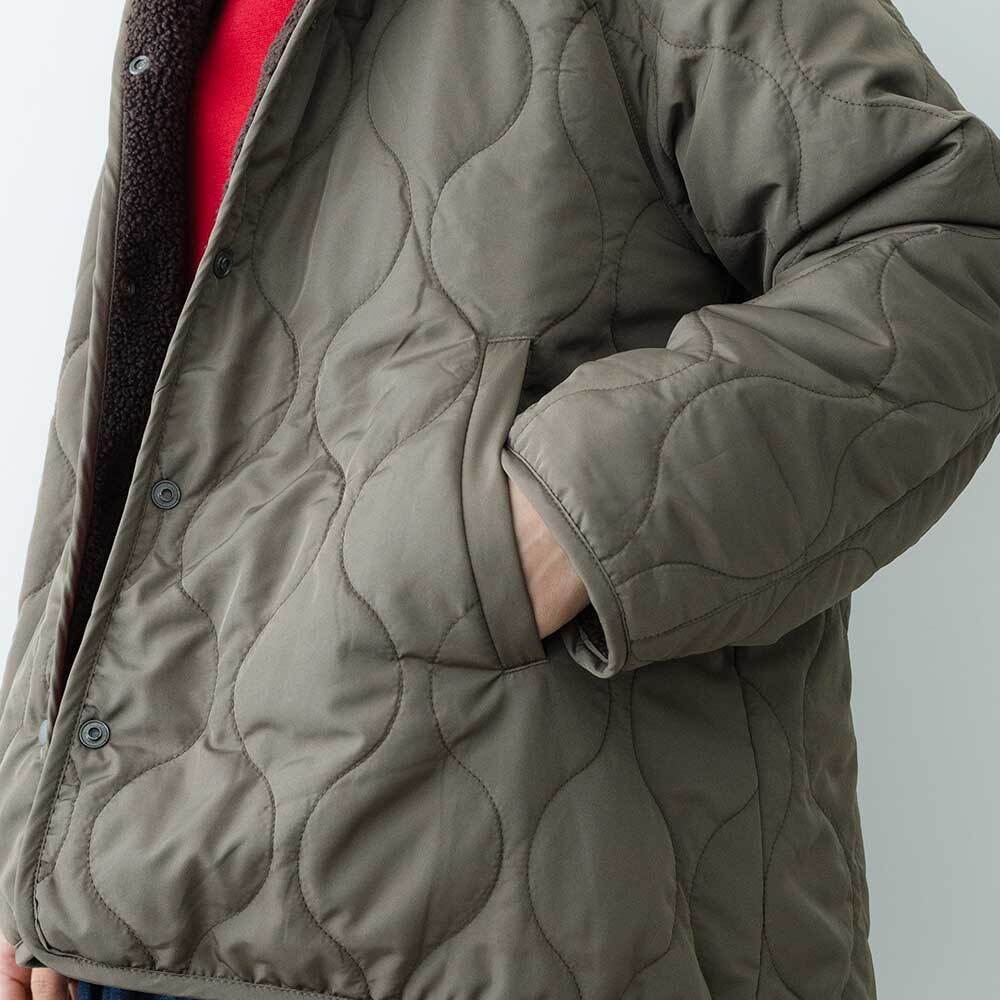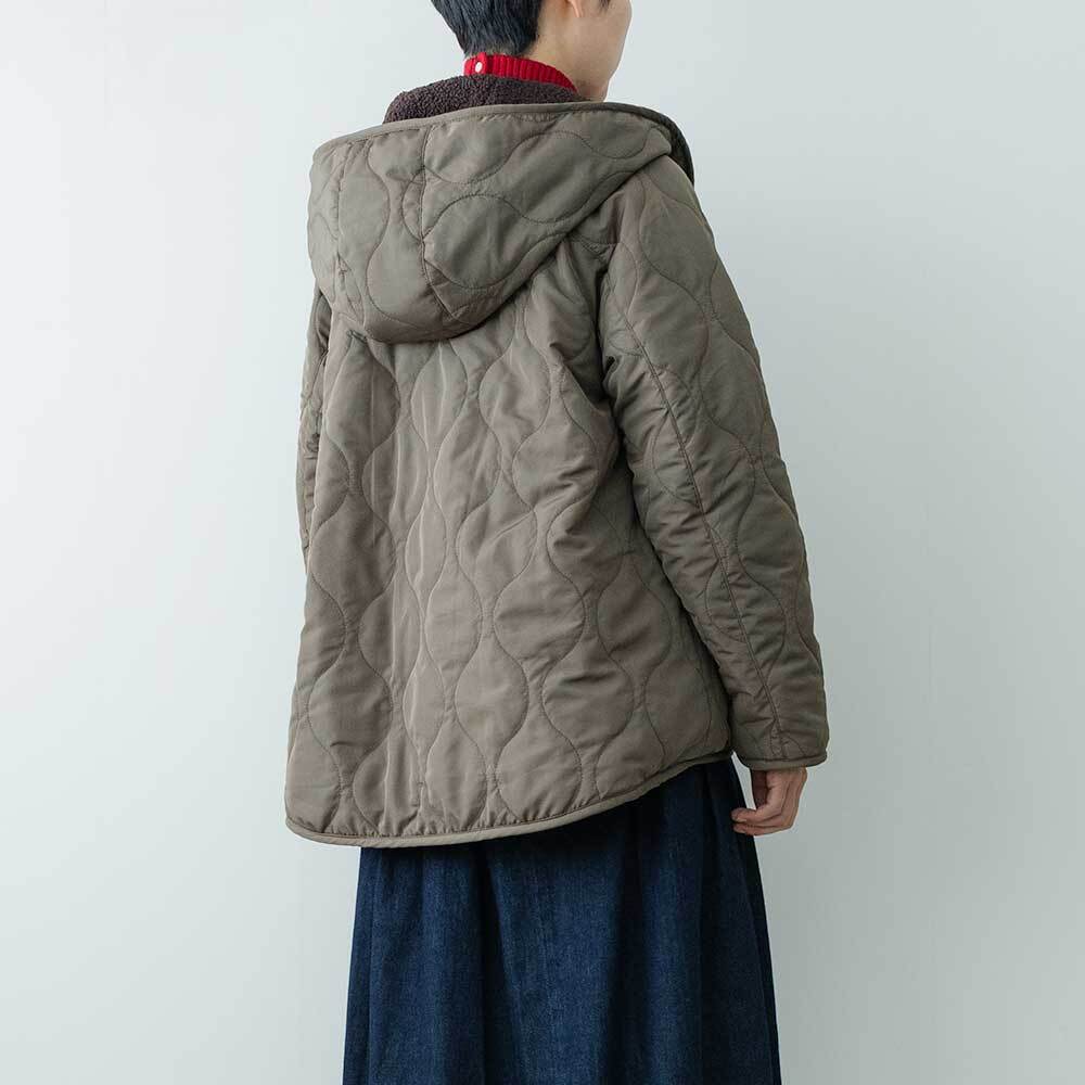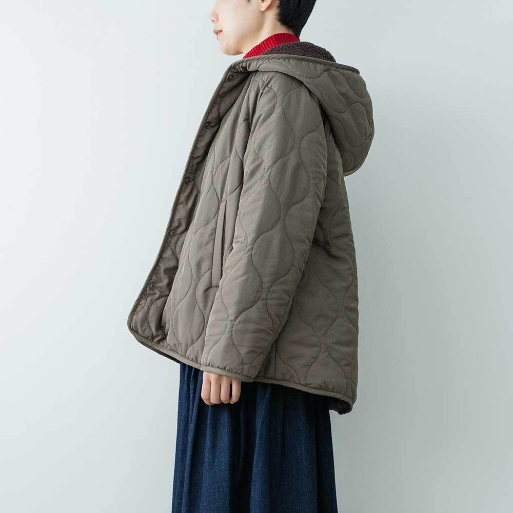 長く愛されるダルマステッチのキルティングリバーシブルフード付きコートです。